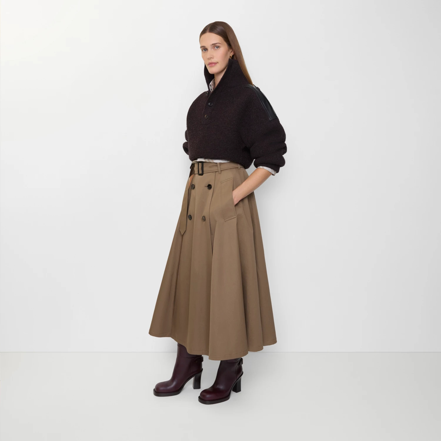 개버딘 트렌치 미디 스커트 > 여성의류