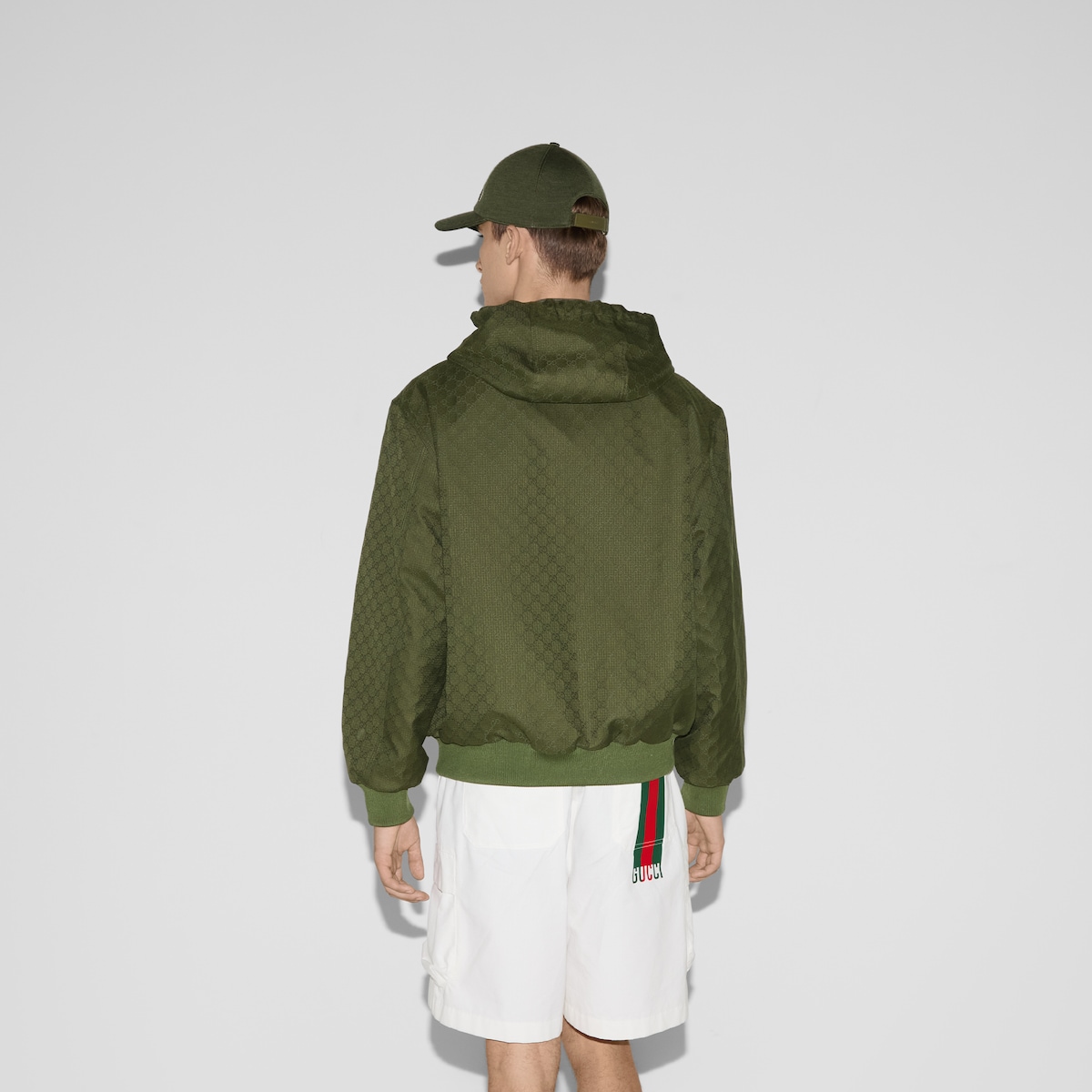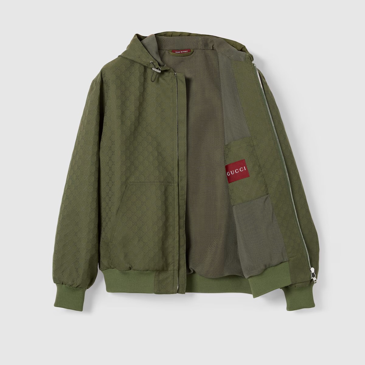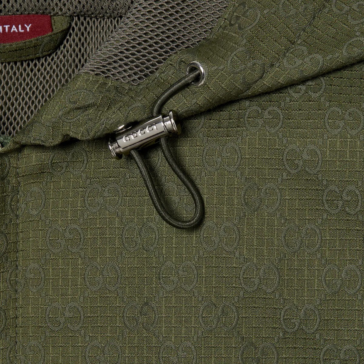 창립자 구찌오 구찌(Guccio Gucci)의 모노그램에서 영감을 얻어 오늘날에도 여전히 열렬한 지지를 받고 있는 GG 모티브. GG 코튼 립스탑과 하프 메시 안감의 조화가 돋보이는 여유로운 실루엣의 재킷.