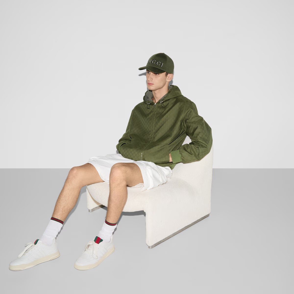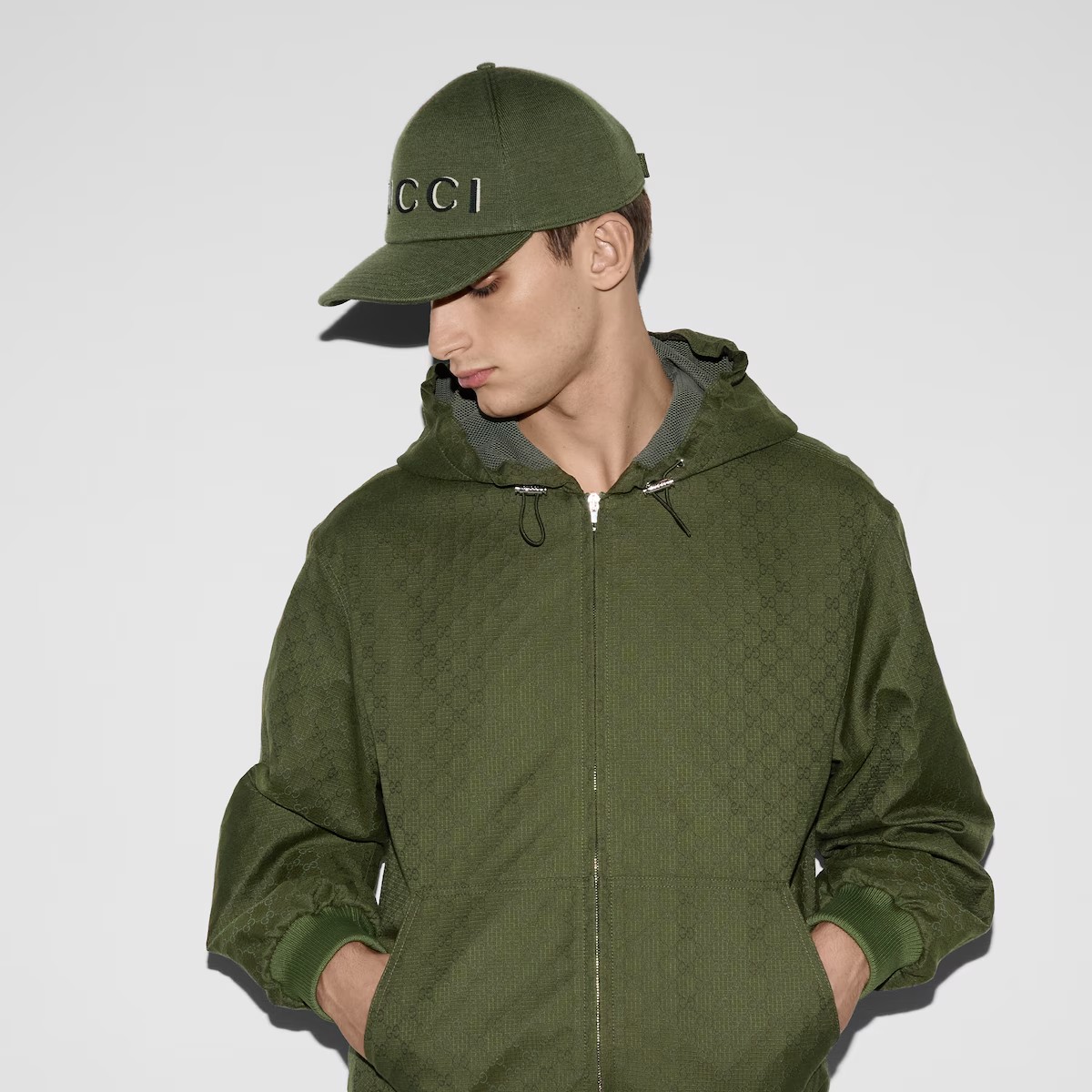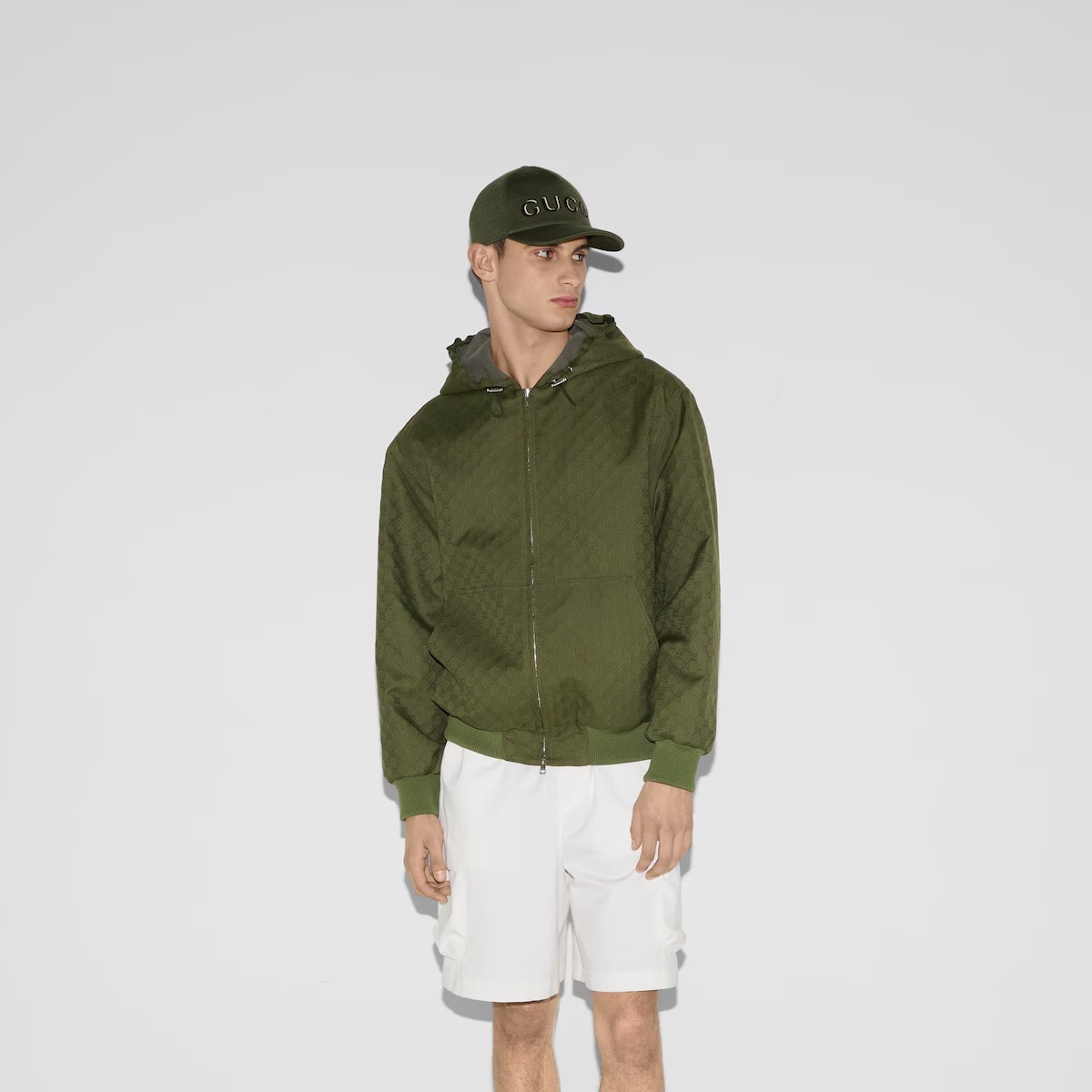 창립자 구찌오 구찌(Guccio Gucci)의 모노그램에서 영감을 얻어 오늘날에도 여전히 열렬한 지지를 받고 있는 GG 모티브. GG 코튼 립스탑과 하프 메시 안감의 조화가 돋보이는 여유로운 실루엣의 재킷.