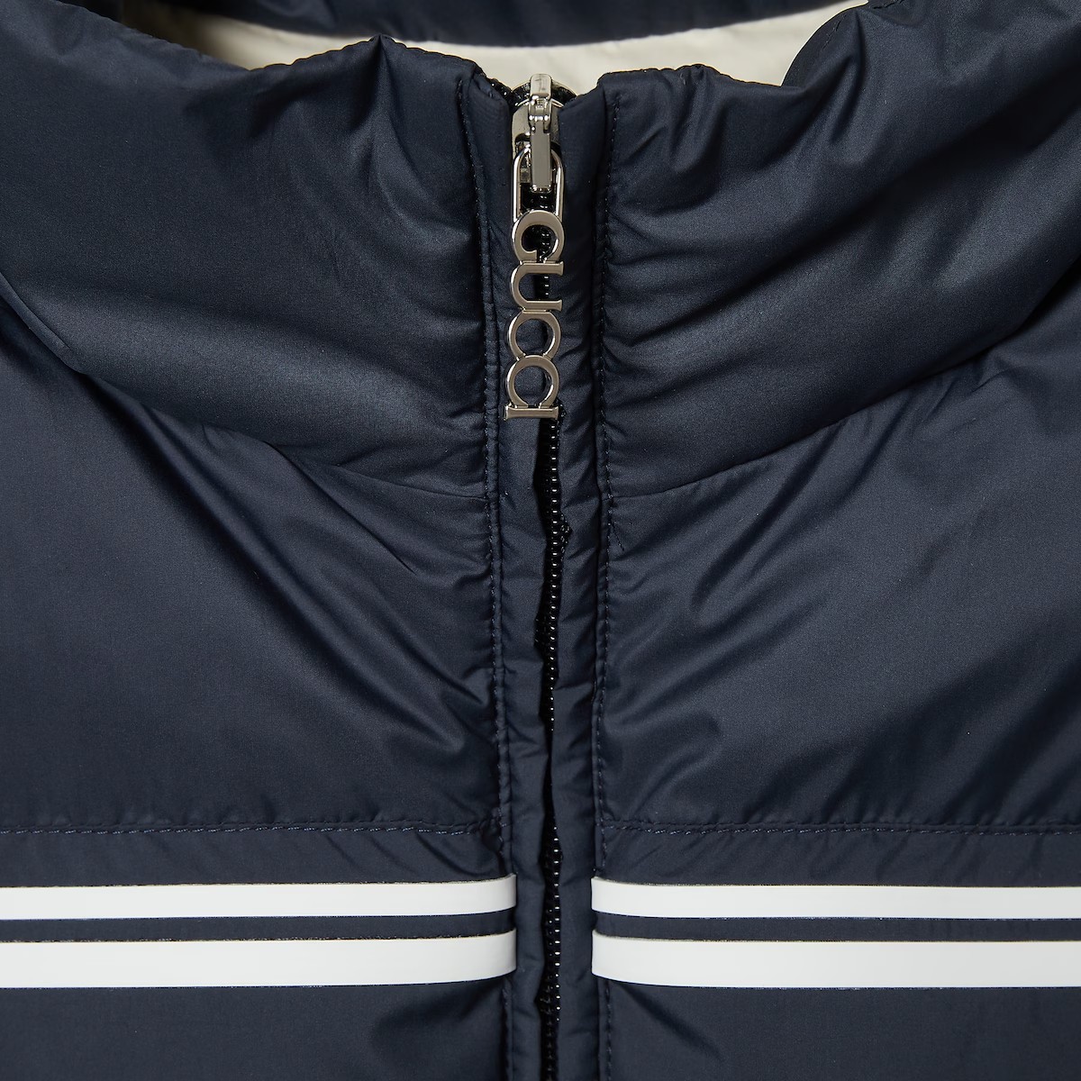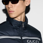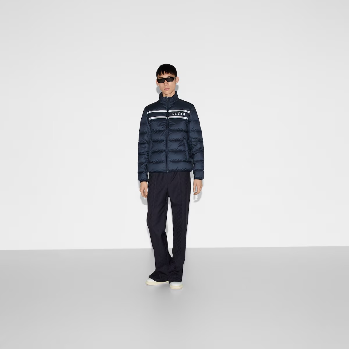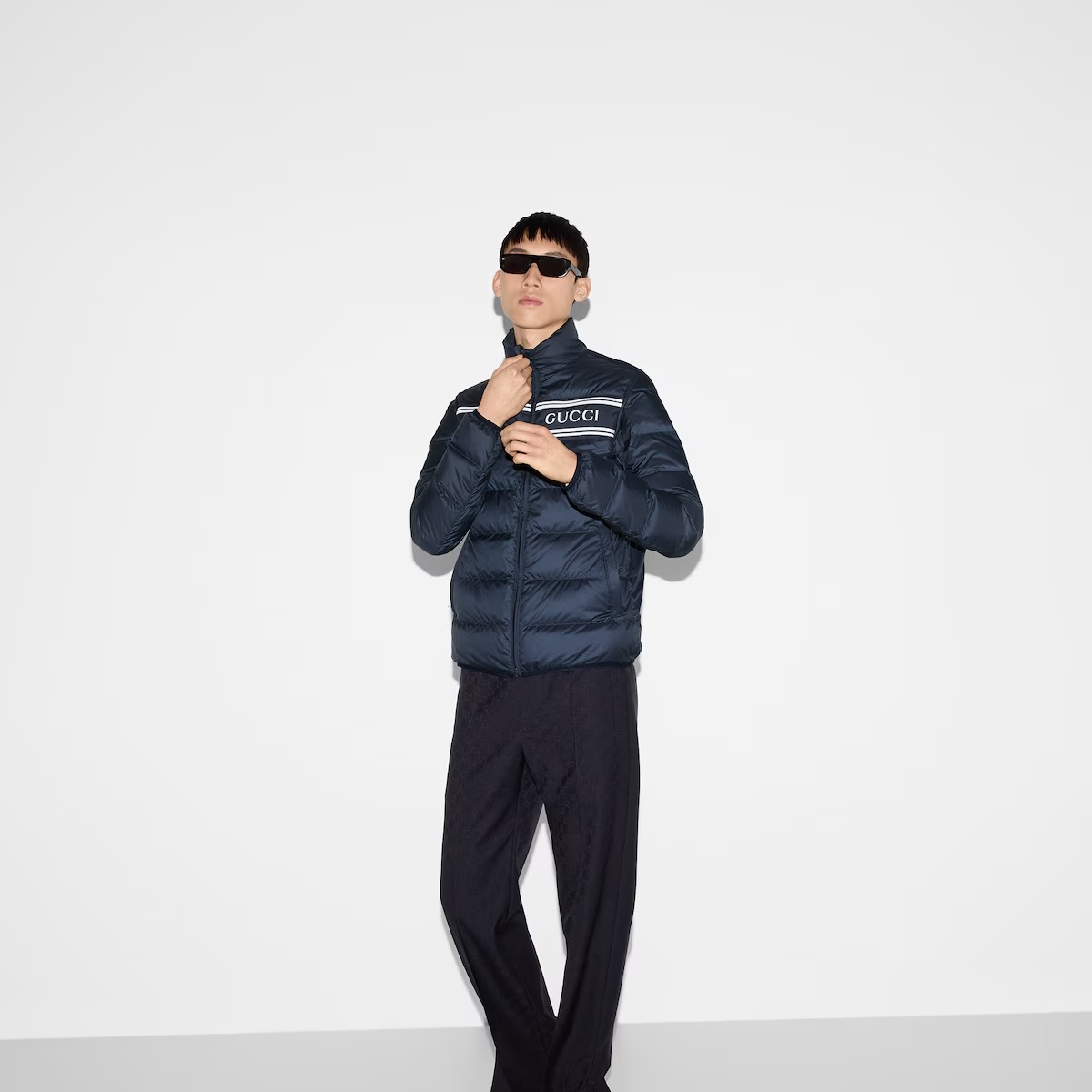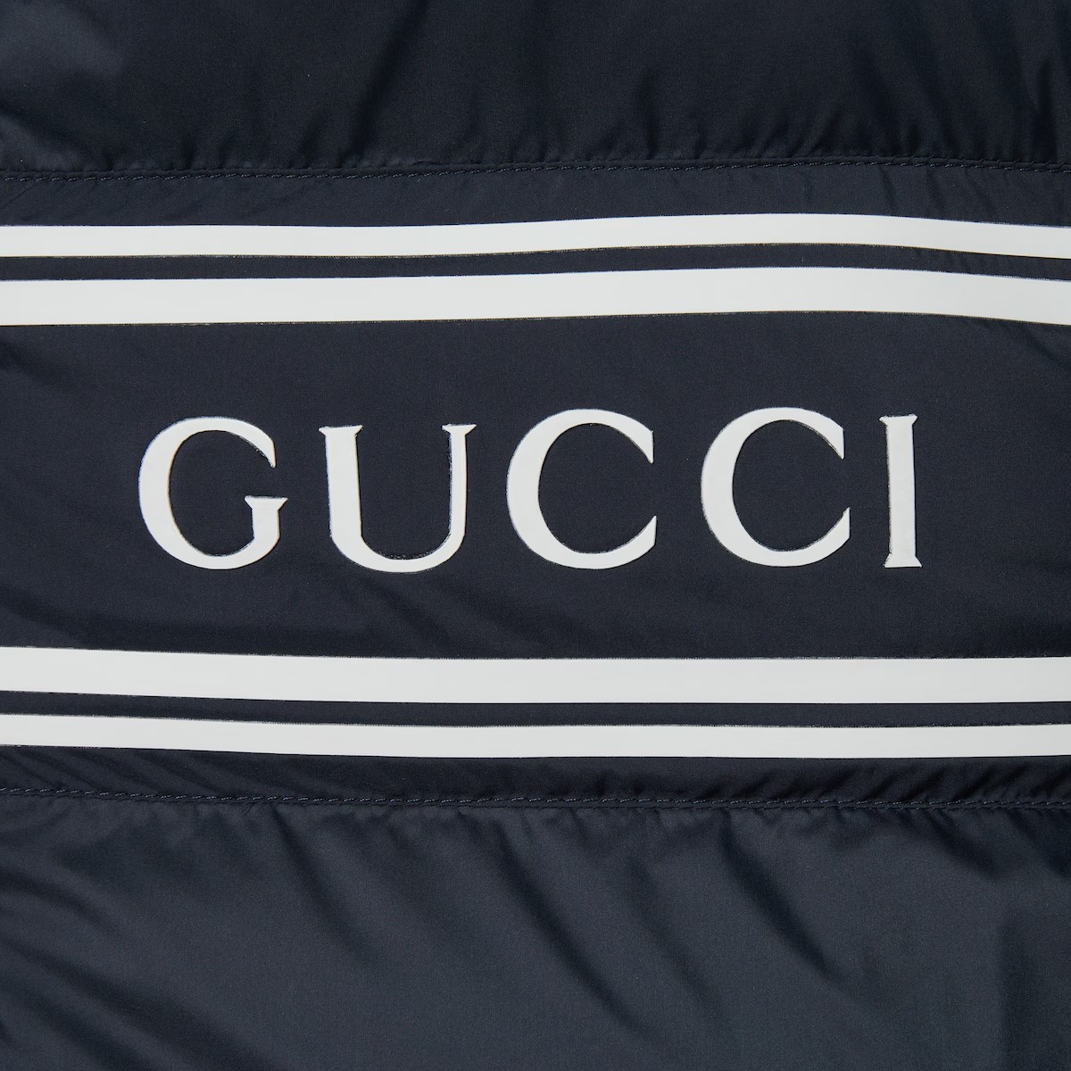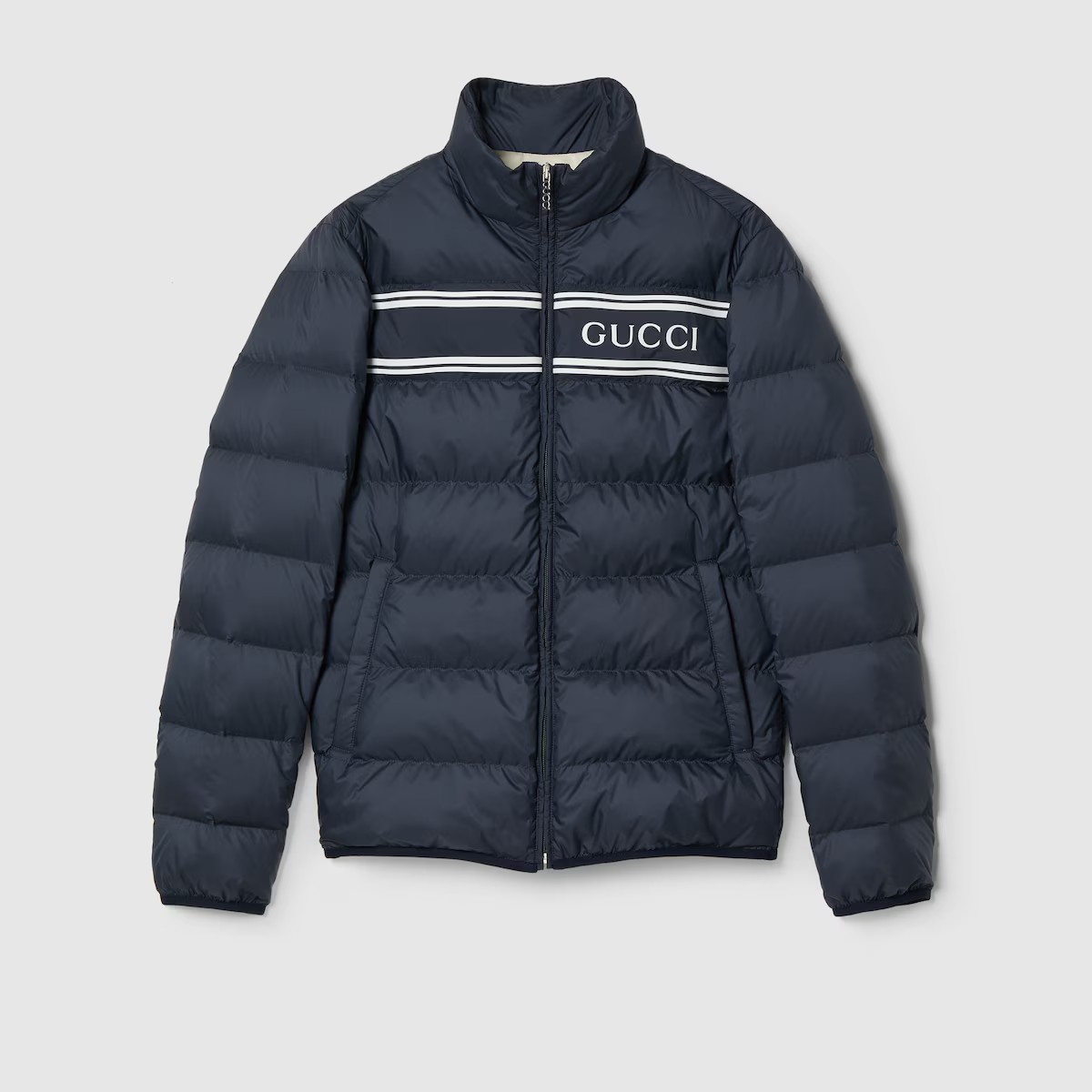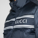 대담한 컬러와 소재의 조합으로 구찌 로고를 표현한 프리폴 컬렉션 아이템. 네이비 나일론 바탕에 가슴 부분을 구찌 스트라이프 프린트로 장식한 경량 푸퍼 재킷. 구찌 지퍼 풀러로 실루엣에 품격을 더함.