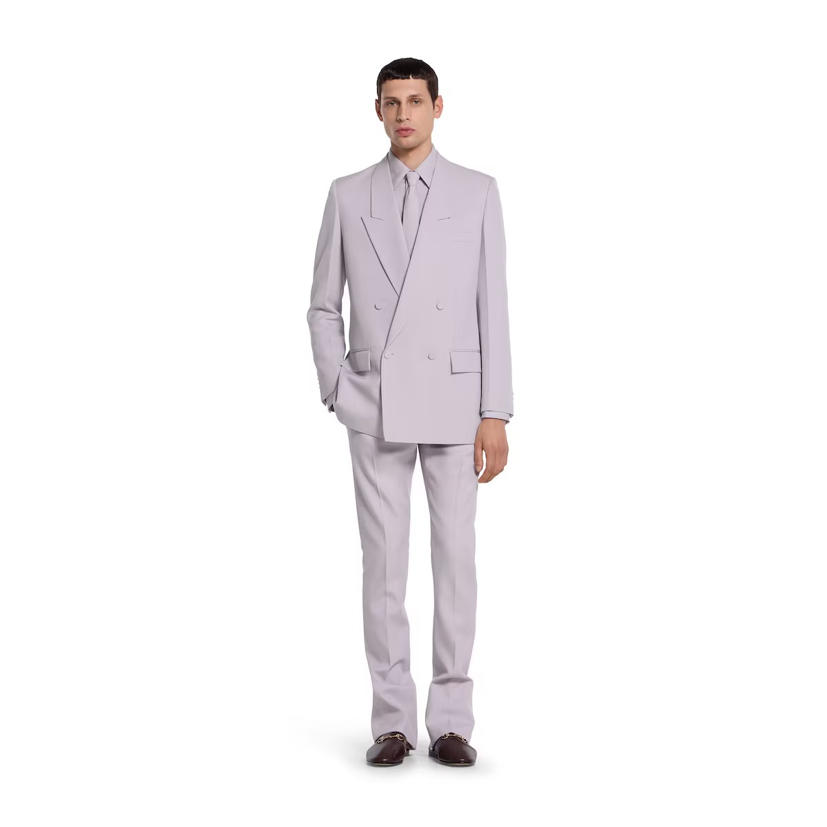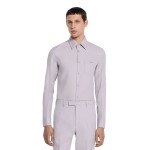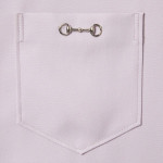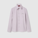 2025 가을-겨울 컬렉션, 구찌의 클래식 코드와 깔끔한 실루엣의 만남. 체스트 포켓의 메탈 홀스빗 디테일로 더욱 풍성해진 슬림 핏 셔츠. 드러나지 않는 버튼 클로저, 포인트 카라, 롱 슬리브로 스타일을 완성함.