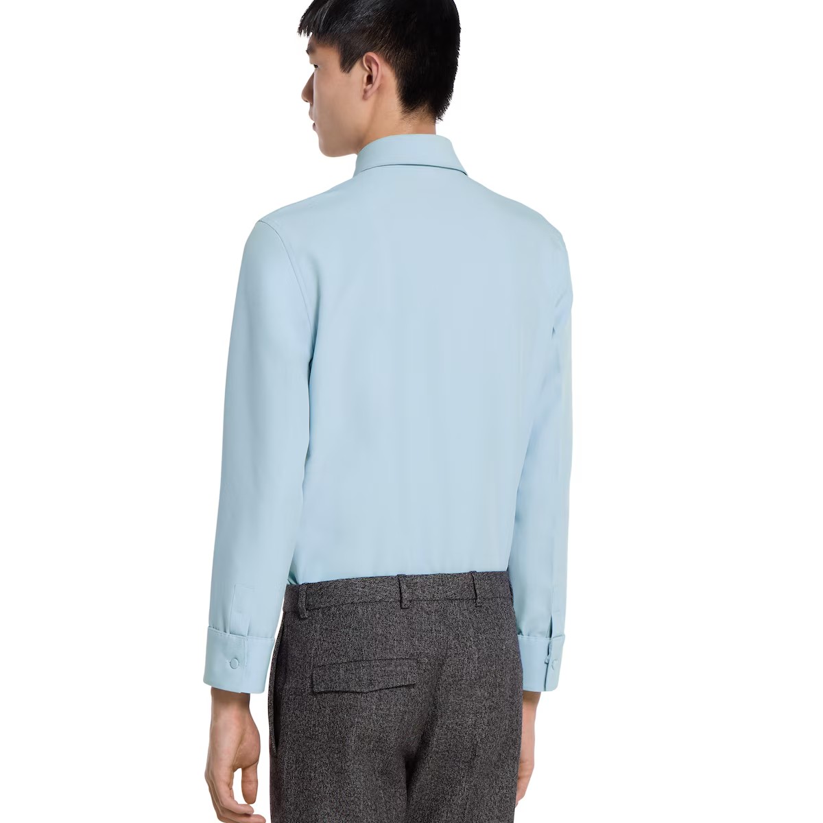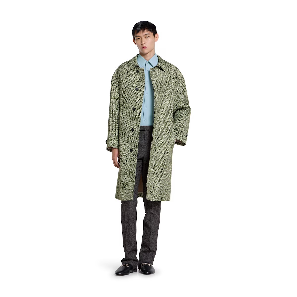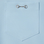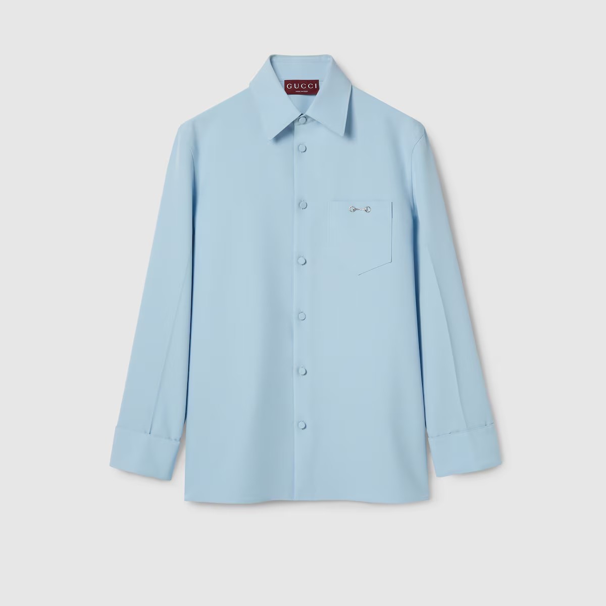 2025 가을-겨울 컬렉션, 구찌의 클래식 코드와 깔끔한 실루엣의 만남. 체스트 포켓의 메탈 홀스빗 디테일로 더욱 풍성해진 슬림 핏 셔츠. 드러나지 않는 버튼 클로저, 포인트 카라, 롱 슬리브로 스타일을 완성함.