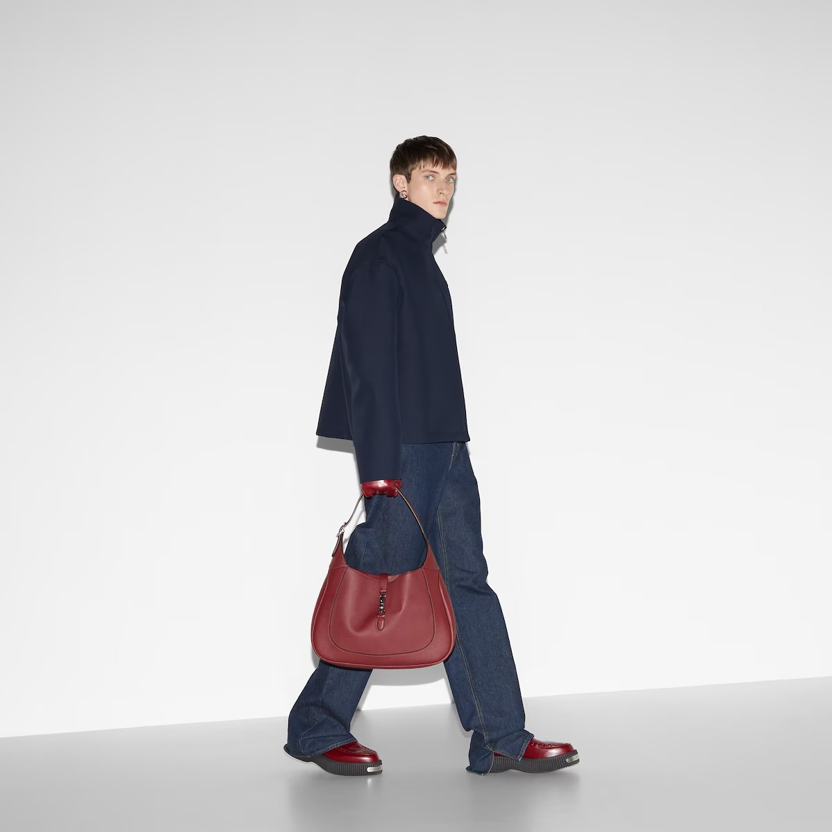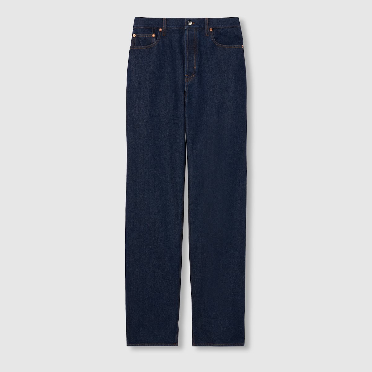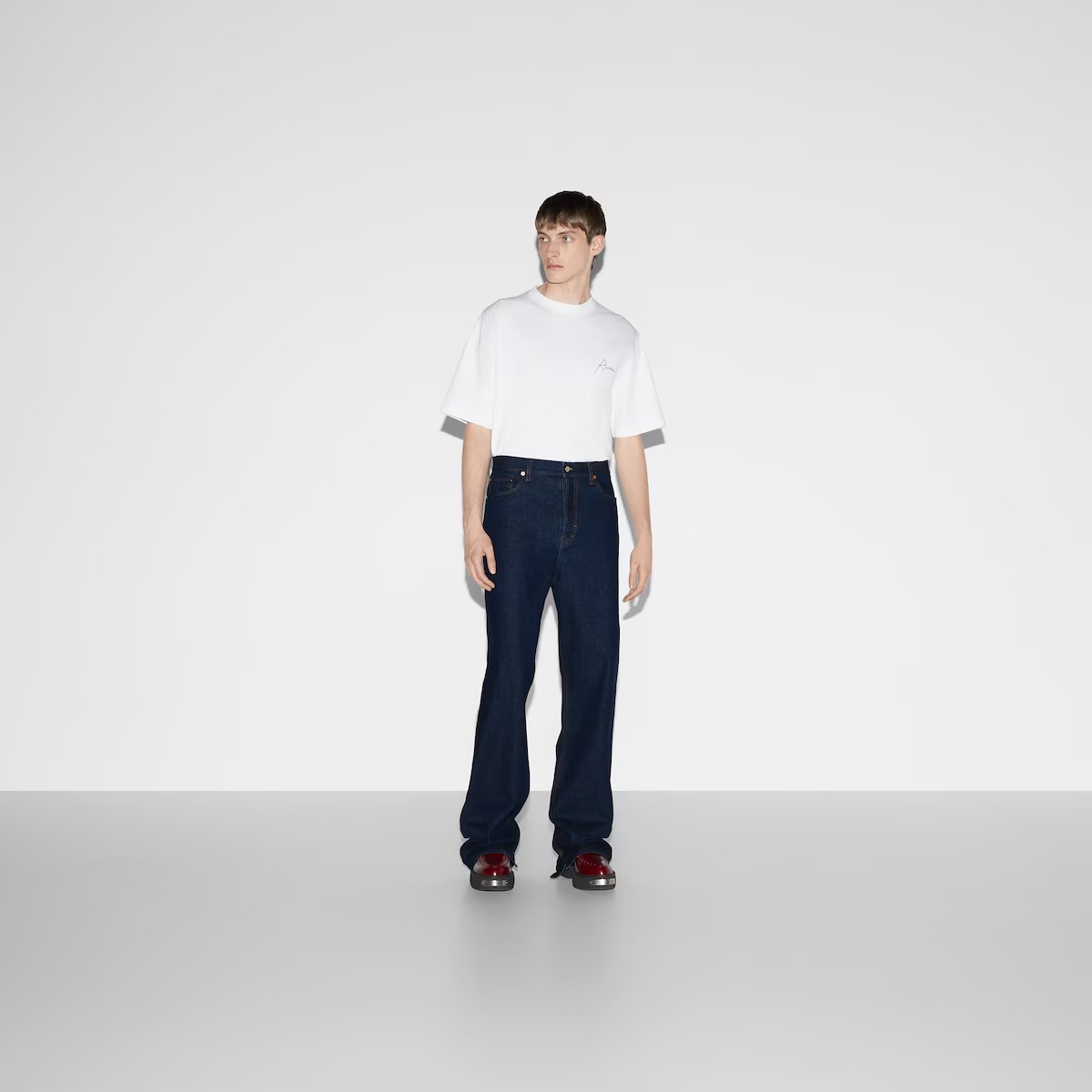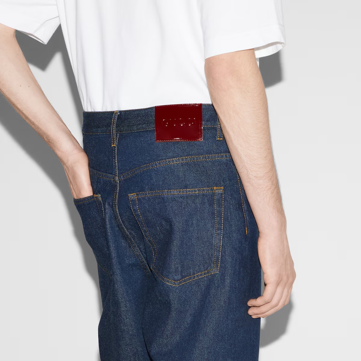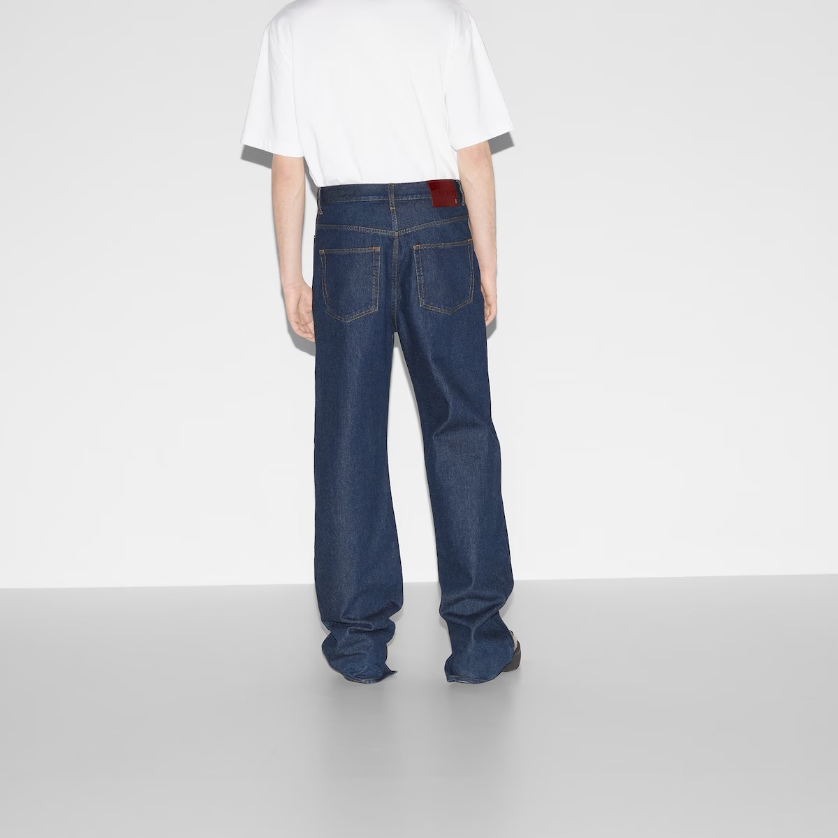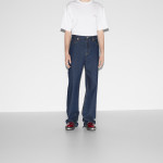 하우스가 2024 가을 겨울 컬렉션에서 착용감과 핏을 중심으로 재해석하여 선보인 남성 필수 아이템. 로맨틱한 감성과 부드러운 펑크가 어우러지는 클래식 데님 팬츠. 구찌 로쏘 앙코라 나플락 라벨이 배기 스타일을 완성.