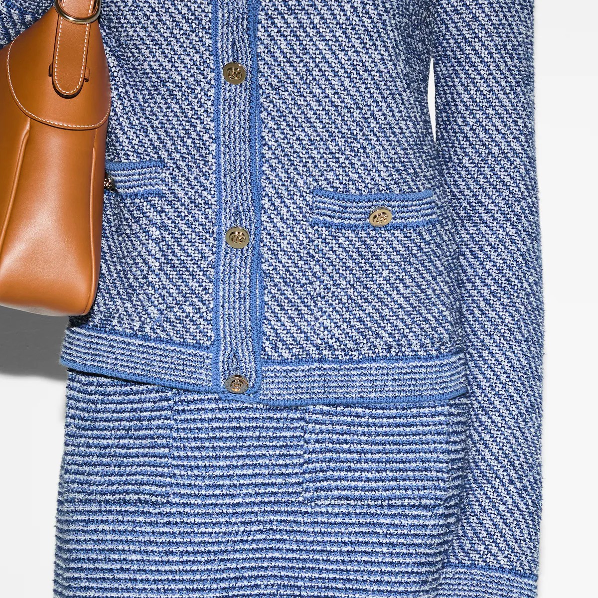 2025 크루즈 컬렉션에서 파인 코튼 니트로 선보인 크루넥 가디건. 세련된 라이트 블루 컬러에 골드 톤 더블 G 버튼으로 품격을 더한 디자인.