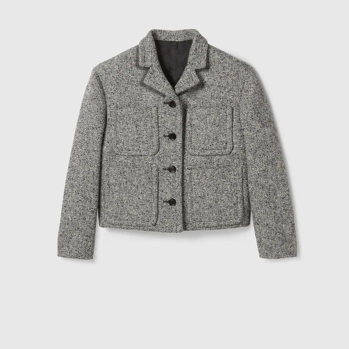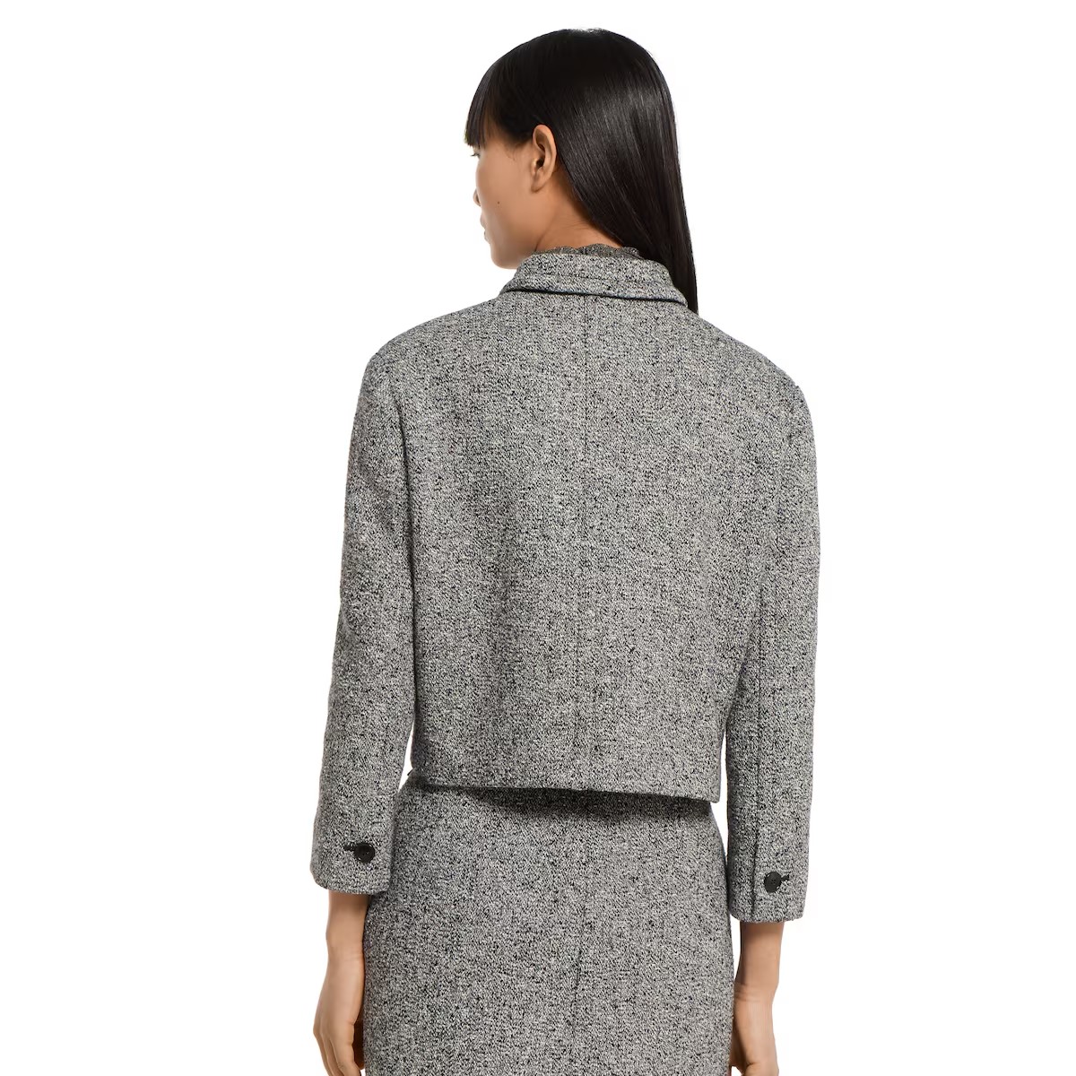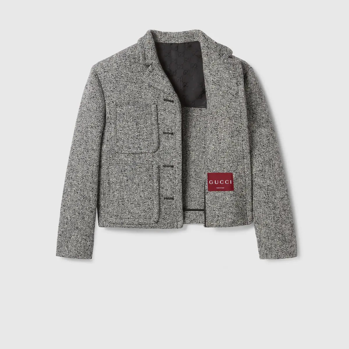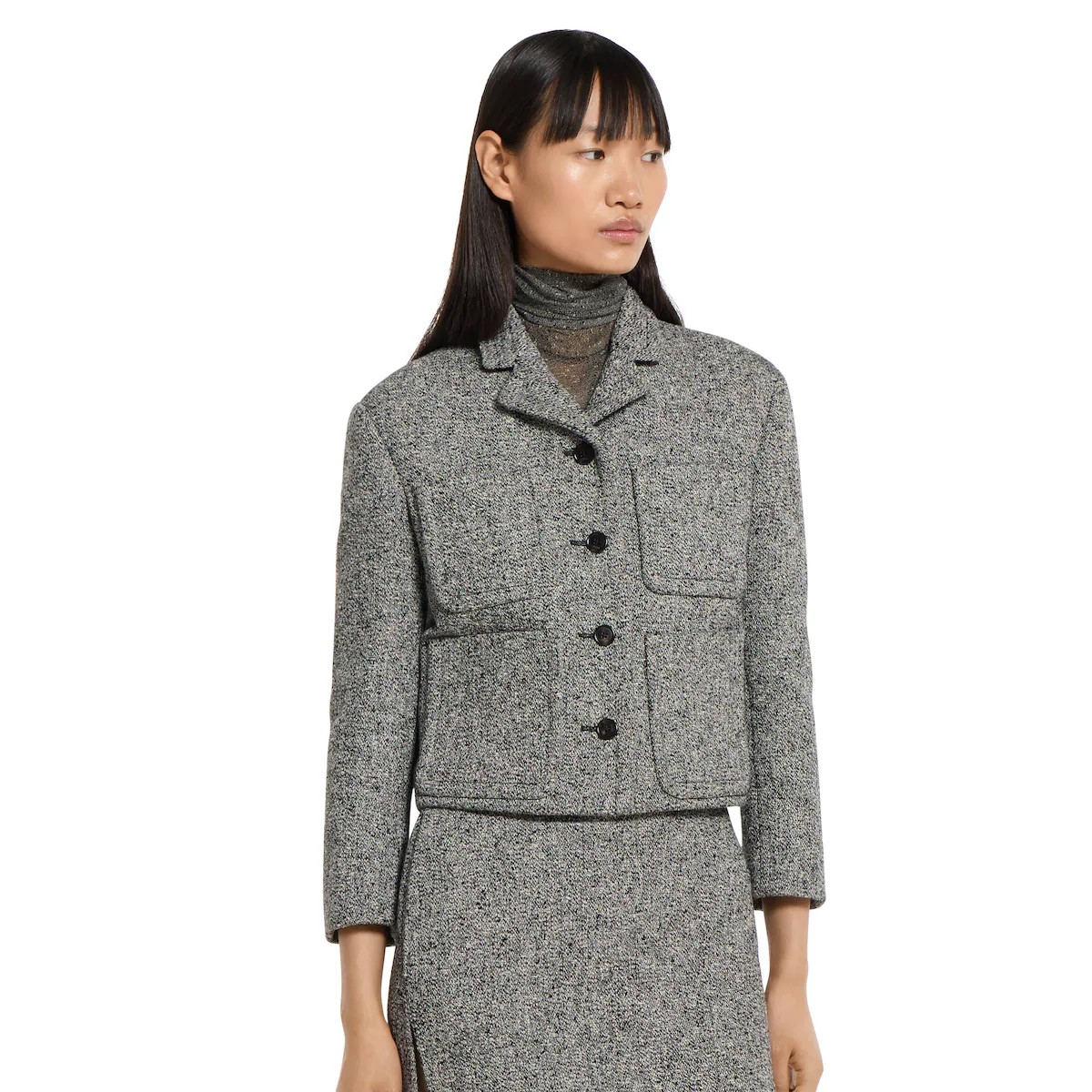 정교한 컷과 컴팩트한 비율로 세련되게 재해석한 2025 가을-겨울 컬렉션의 유틸리티 아이템. 피크 라펠, 앞면 플랩 패치 포켓 4개, 버튼업 앞면이 돋보이는 크롭 재킷. 하프 라이닝.