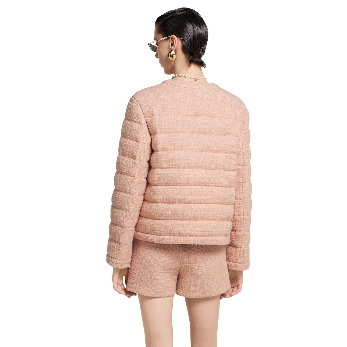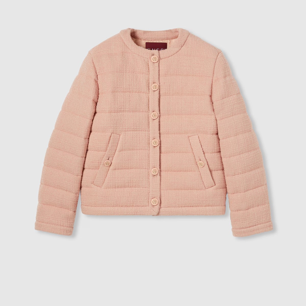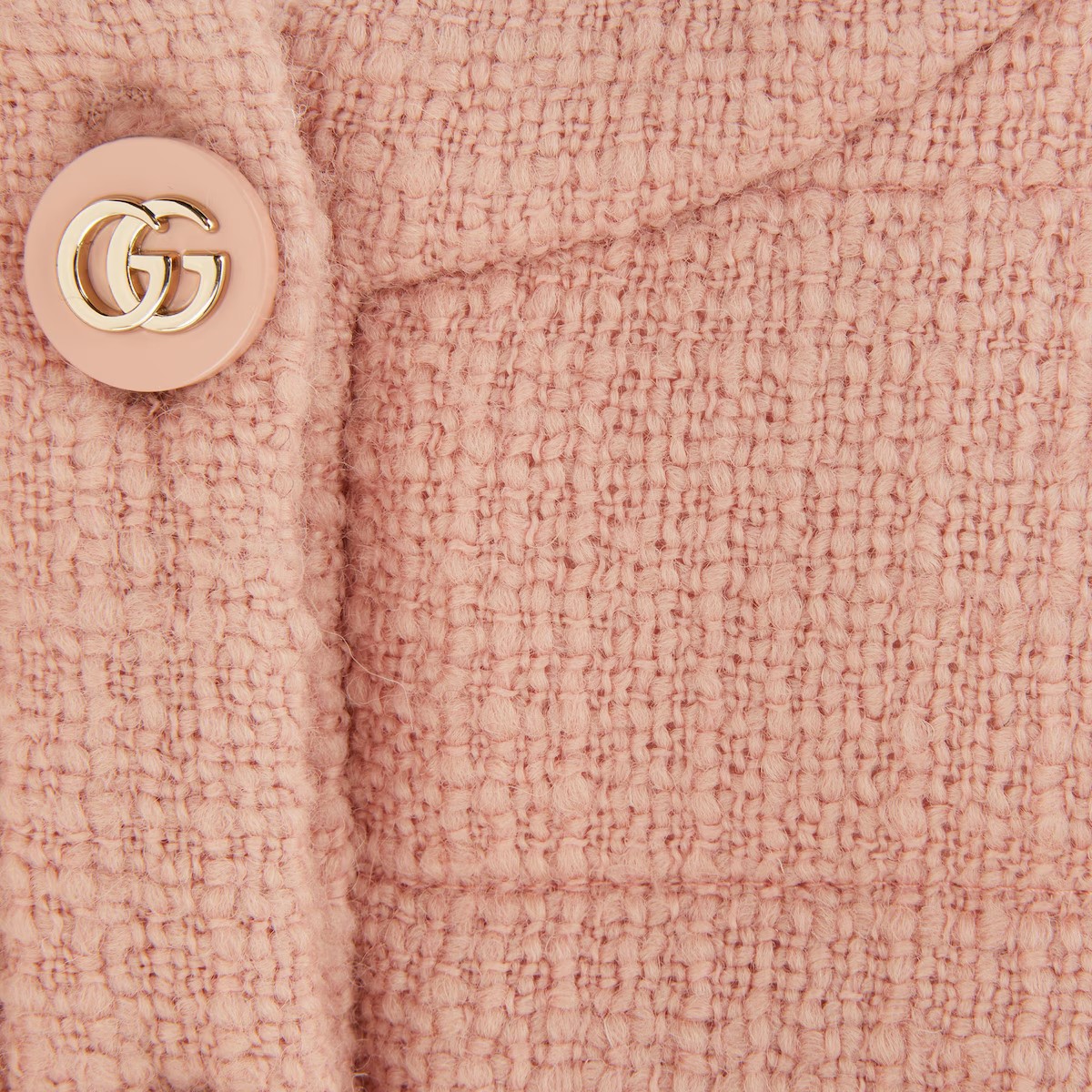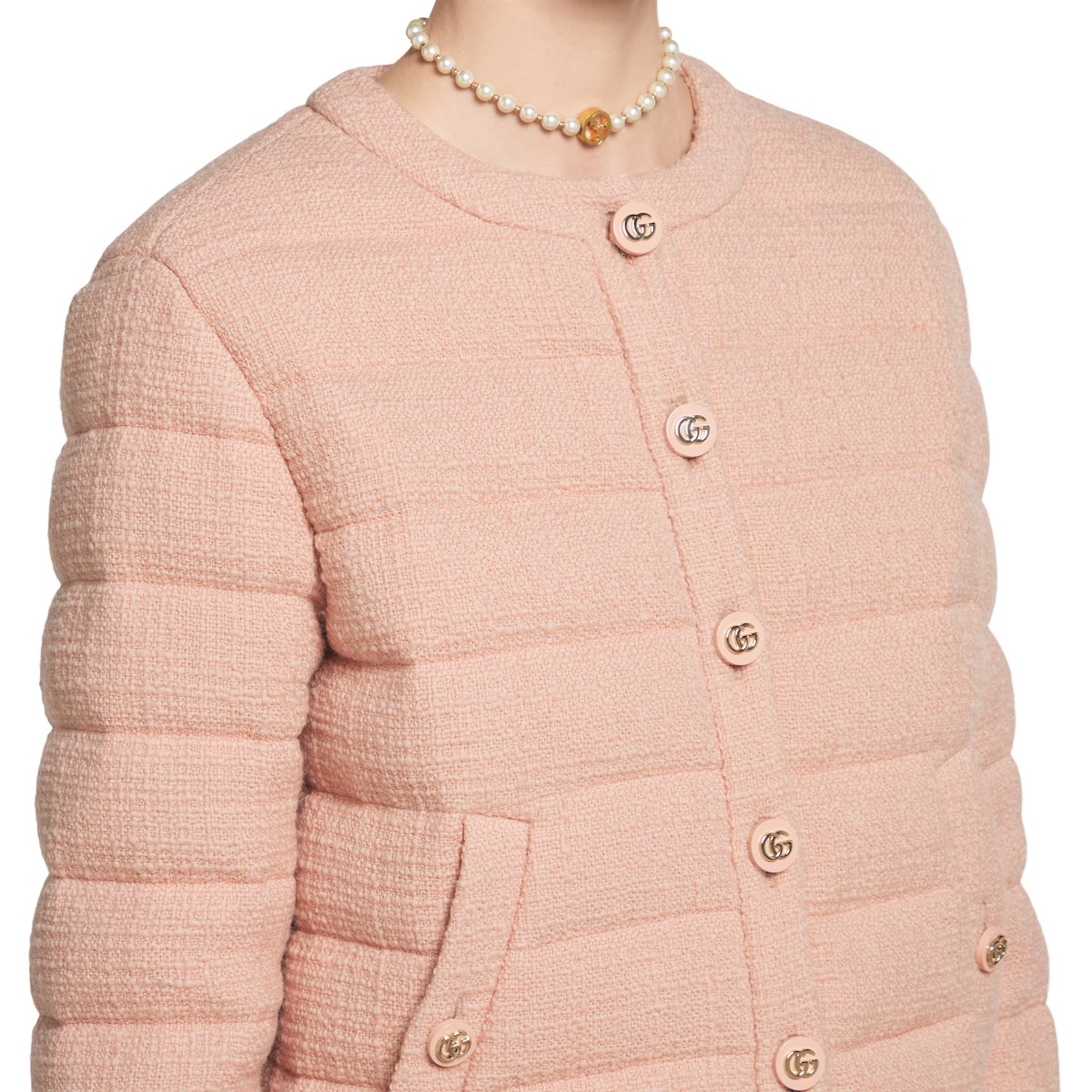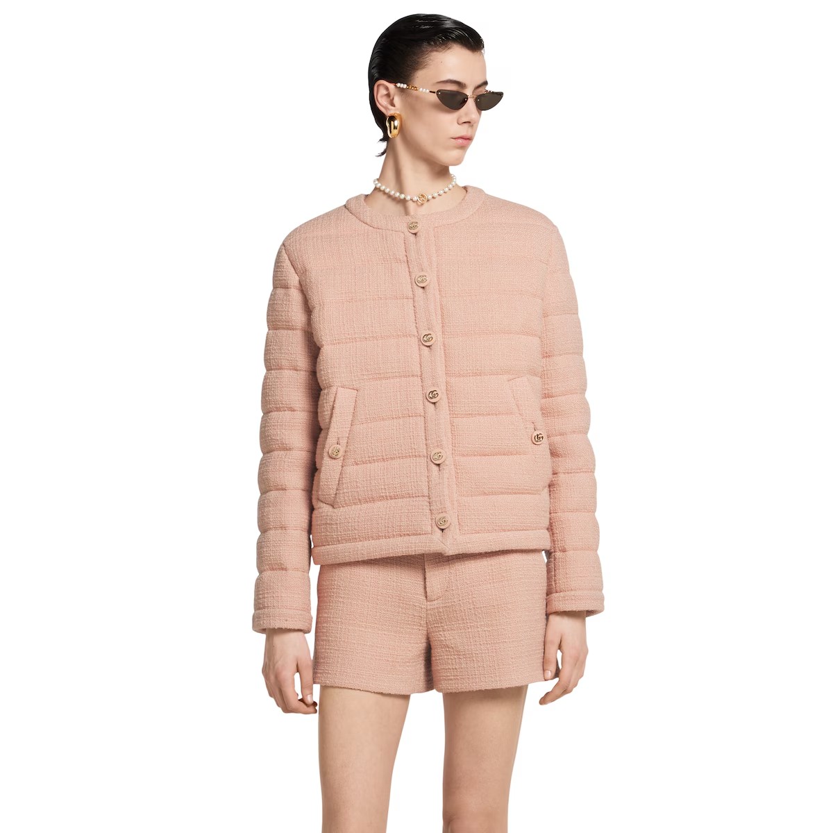 절제된 우아함과 세련된 디테일이 조화를 이룬 2025 프리폴 컬렉션의 코트와 재킷, 드레스. 섬세한 색조와 텍스처드 울 트위드 소재의 본톤 스타일로 선보이는 패딩 재킷. 더블 G 버튼으로 완성된 디자인.