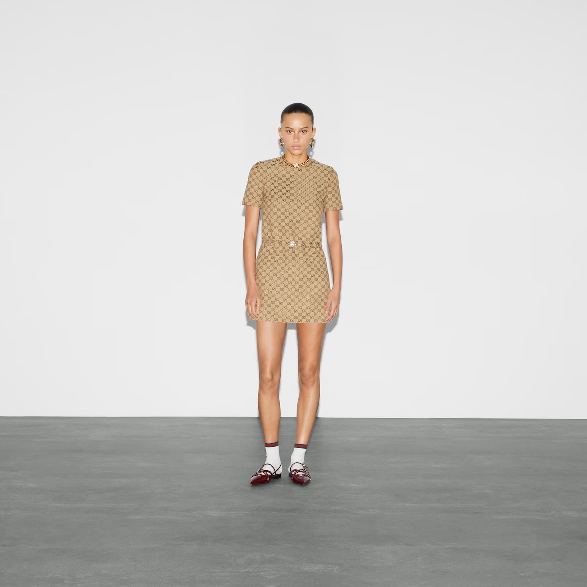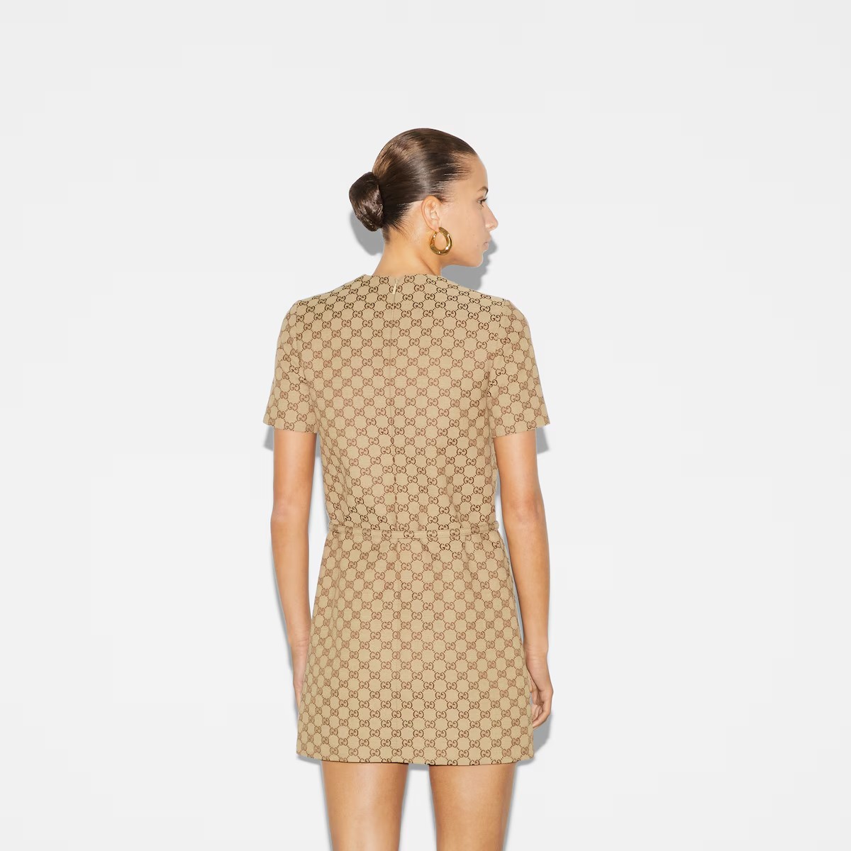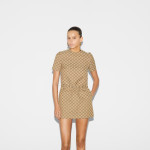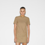 다가오는 쌀쌀한 계절을 위해 부드러운 질감과 보온성을 갖춘 고급 소재 채택 카멜/에보니 GG 캔버스 소재에 더블 G 버클로 장식한 조절식 레더 벨트가 시선을 사로잡는 레귤러 핏 드레스.