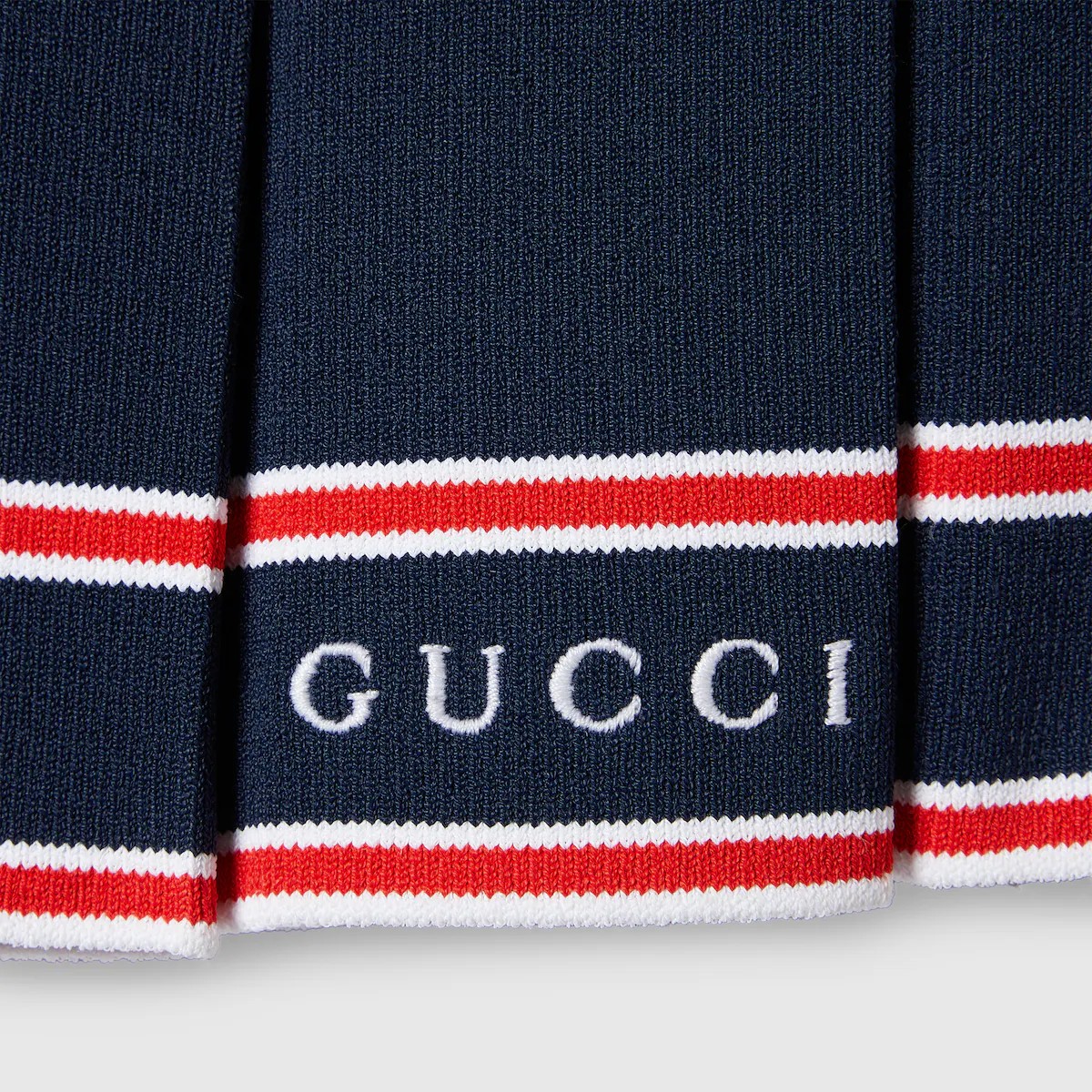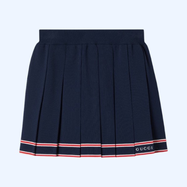 이탈리아 해변의 여름 감성과 비치 클럽의 영감을 표현하는 구찌 리도 컬렉션의 아이템입니다. 저지, 데님 및 그 밖의 다양한 소재로 만든 탑과 팬츠로 무한히 펼쳐지는 스타일링의 가능성. 섬세한 스트레치 비스코스 소재로 편안한 움직임과 착용감을 선사하는 플리츠 스커트. 하우스에 대한 경의를 표현하는 대조적인 스트라이프 트리밍과 구찌 자수로 세련된 디자인을 완성함.