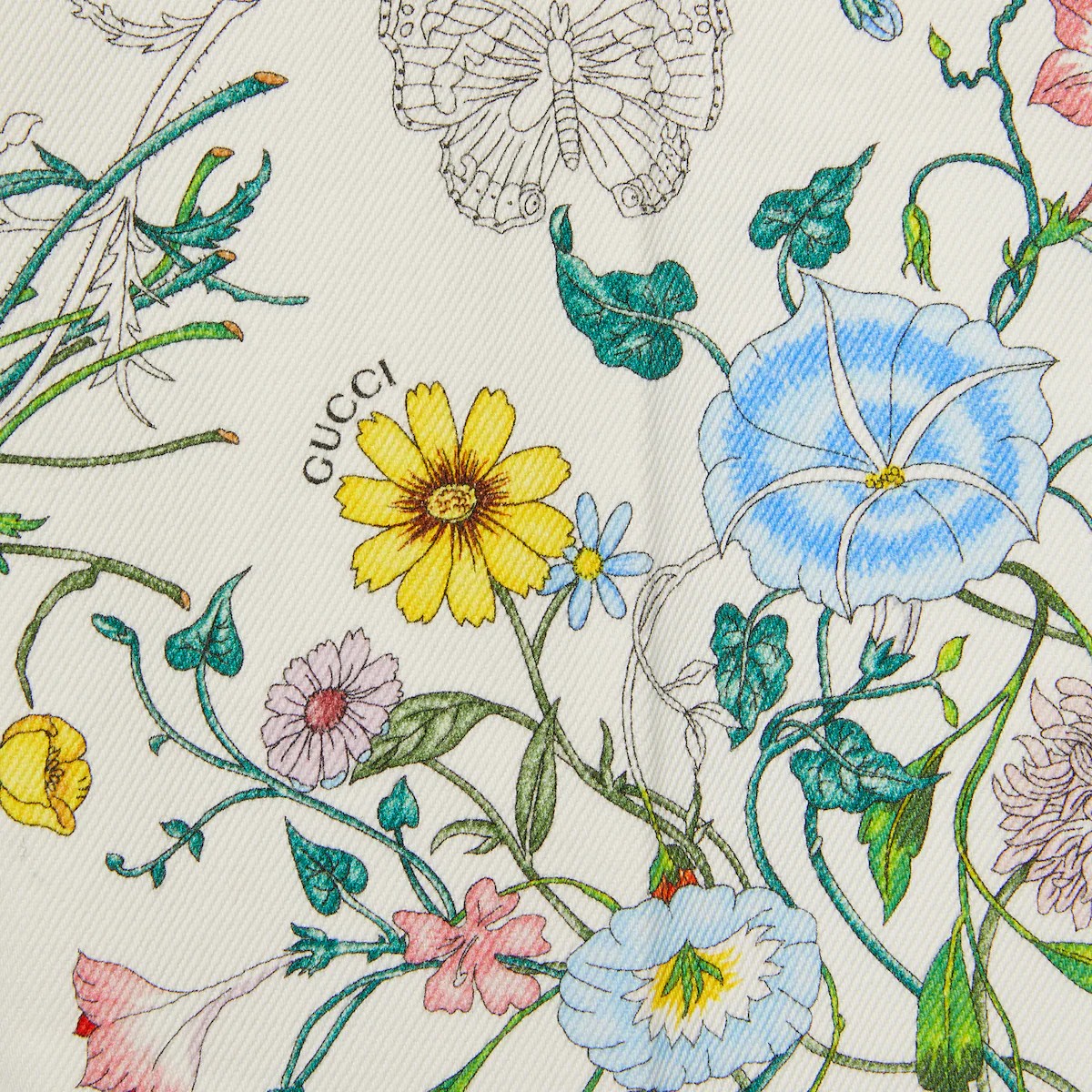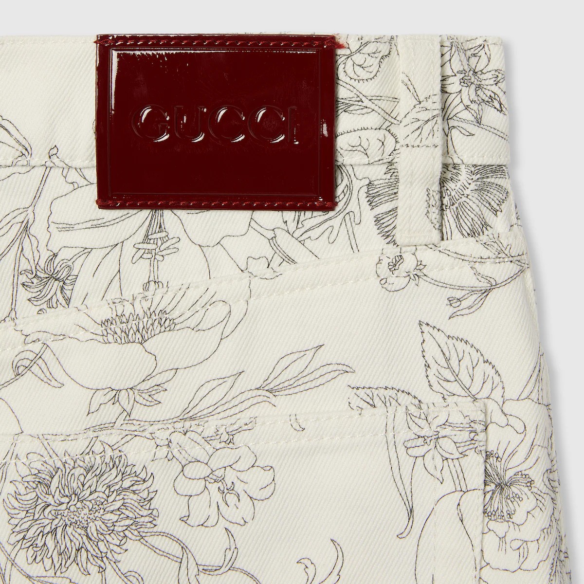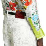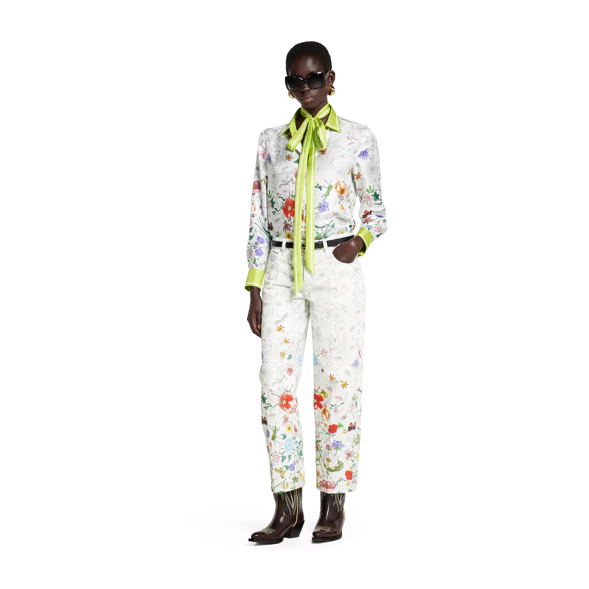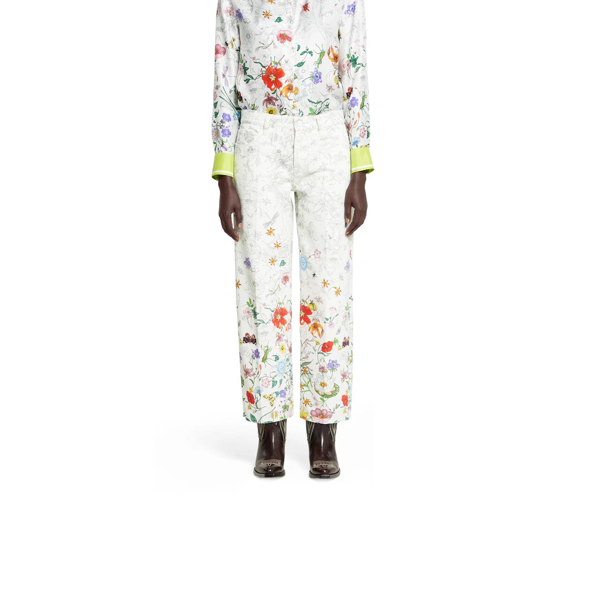 아카이브에서 찾은 1960년대의 플로라 프린트를 현대에 되살린 레디-투-웨어. 2025 프리폴 시즌을 위한 새로운 컬러와 그라데이션에 로맨틱한 감성을 더함. 다리 밑단으로 갈수록 더 짙어지는 데님 팬츠 상단의 프린트.
