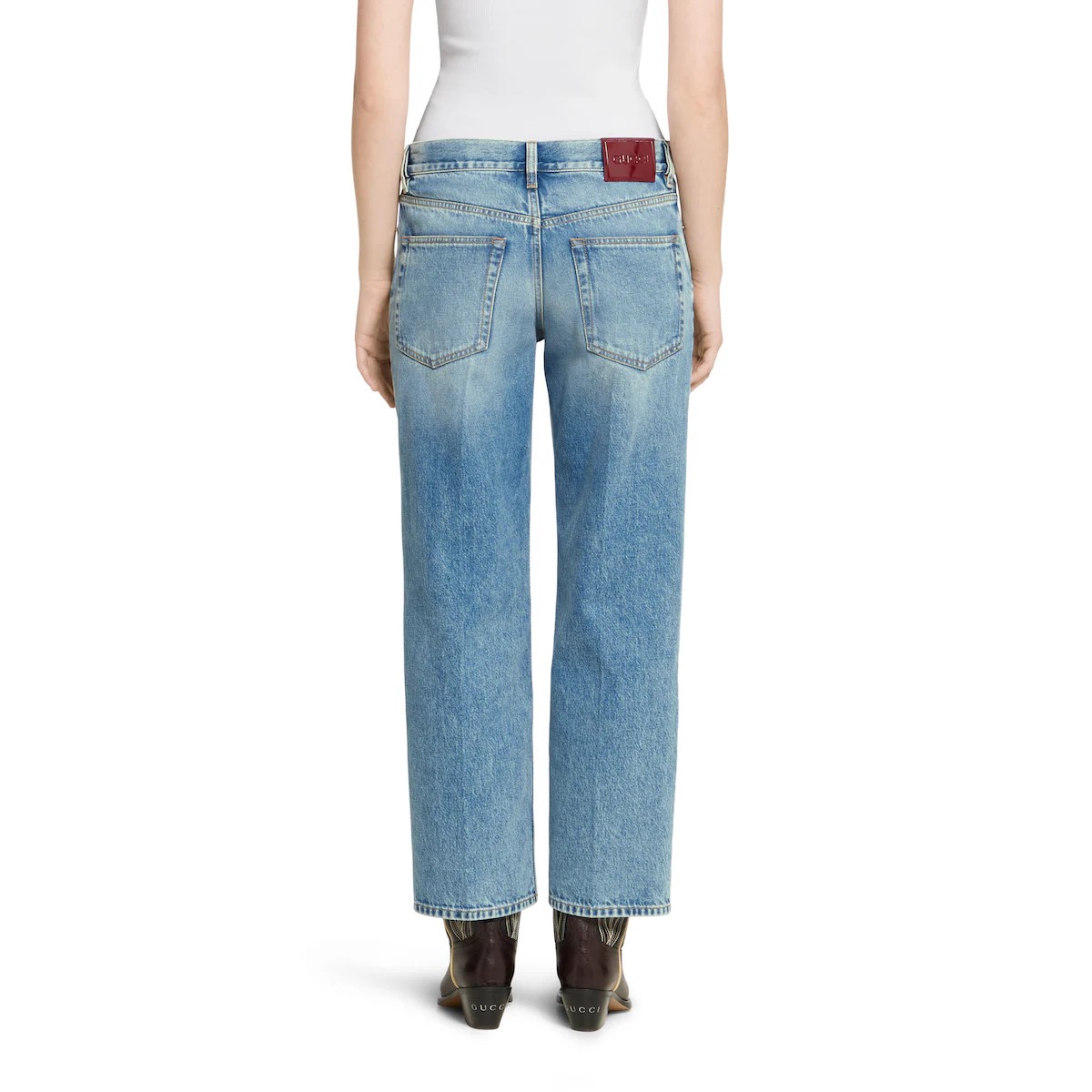 데일리 룩의 품격을 높이는 정교한 디테일로 데님에 대한 참신한 해석을 보여주는 2025 프리폴 컬렉션. 워시드 인증 코튼 데님 소재에 구찌 로소 앙코라 나플락 라벨로 장식된 스트레이트 핏 팬츠.