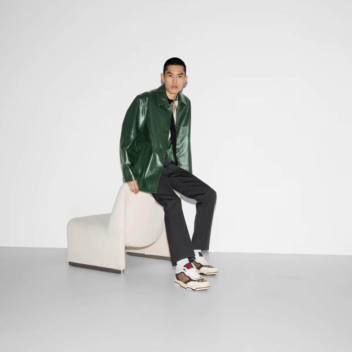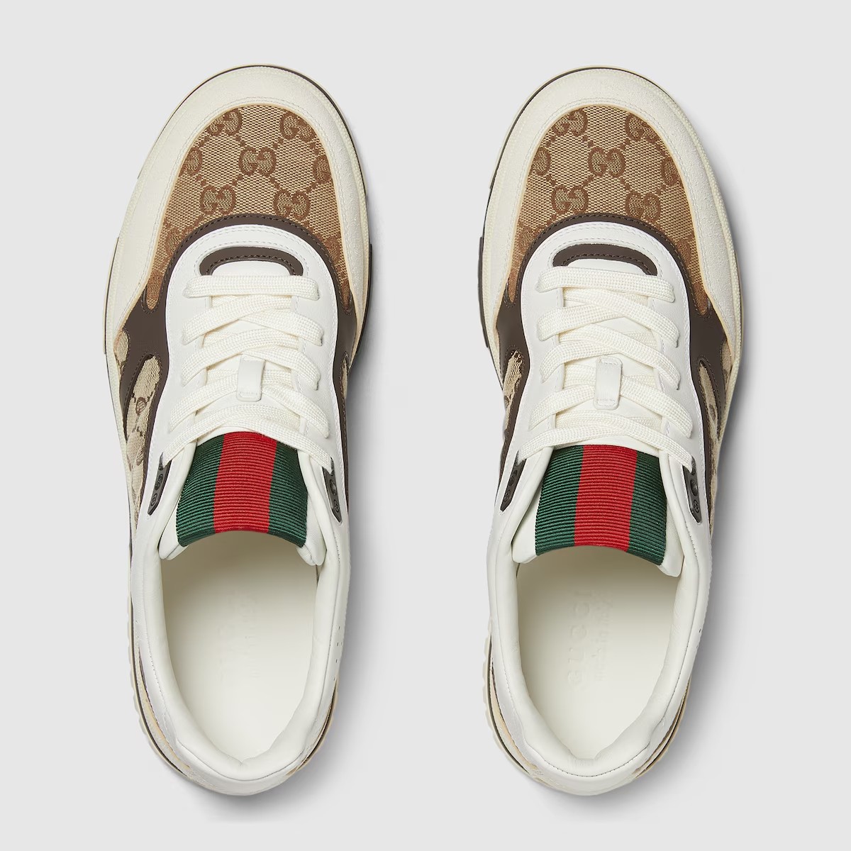 구찌의 정통성이 드러나는 스트라이프를 현대적인 실루엣에 과감한 디테일로 표현한 리웹(Re-Web). 베이지/에보니 오리지널 GG 캔버스, 그린/레드 웹(Web) 텅 등 아이코닉한 디테일이 시선을 사로잡는 스니커즈.
