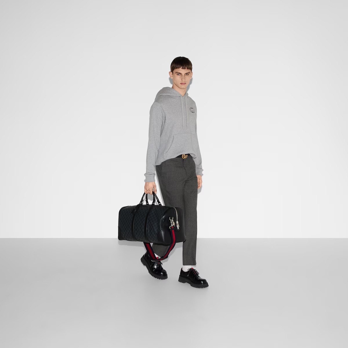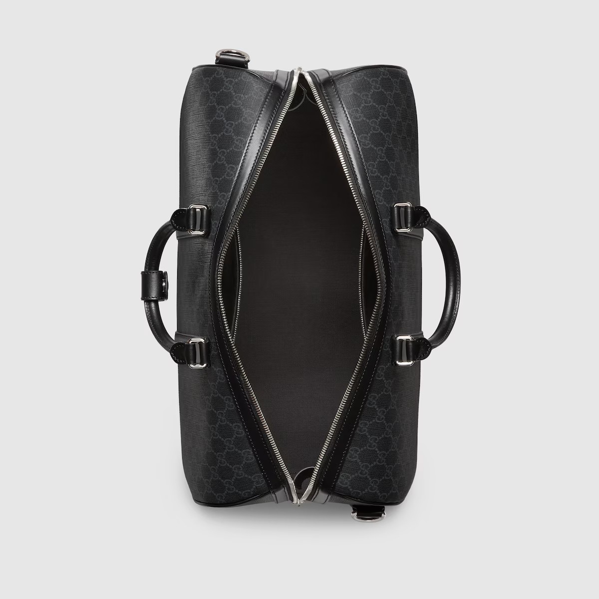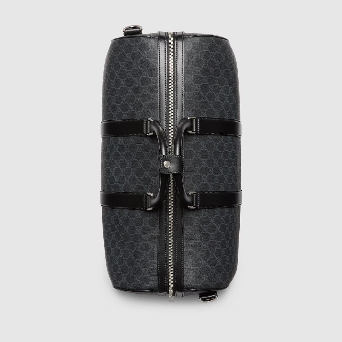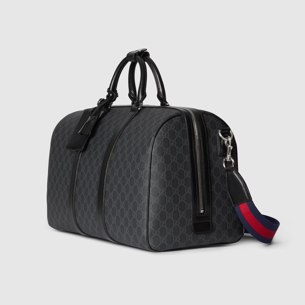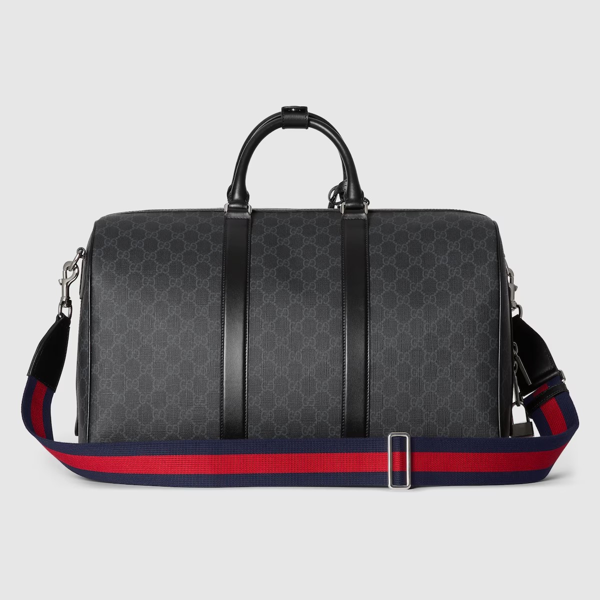 부드럽고 재단에 적합한 품질로 하우스의 꾸준한 사랑을 받는 시그니처 GG 수프림 캔버스. 코팅 마이크로파이버 소재의 올 블랙 버전으로 선보이는 더플백. 비슷한 톤 배색의 레더 트리밍으로 스타일을 완성하고 아카이브 스타일의 웹(Web) 스트라이프로 컬러 액센트를 살린 디자인.