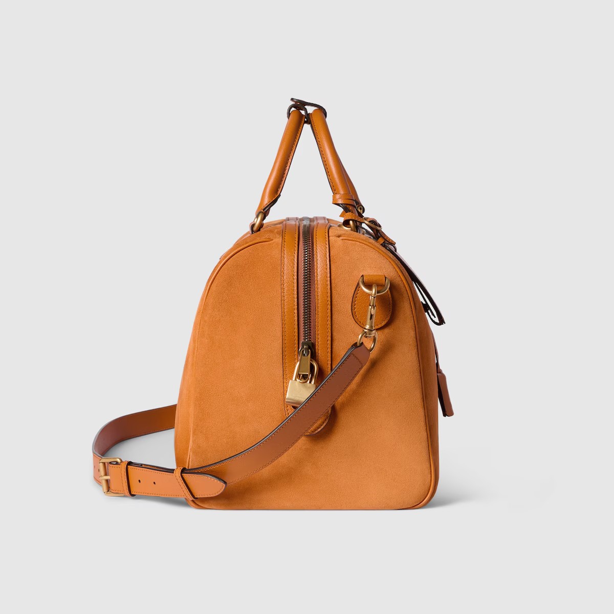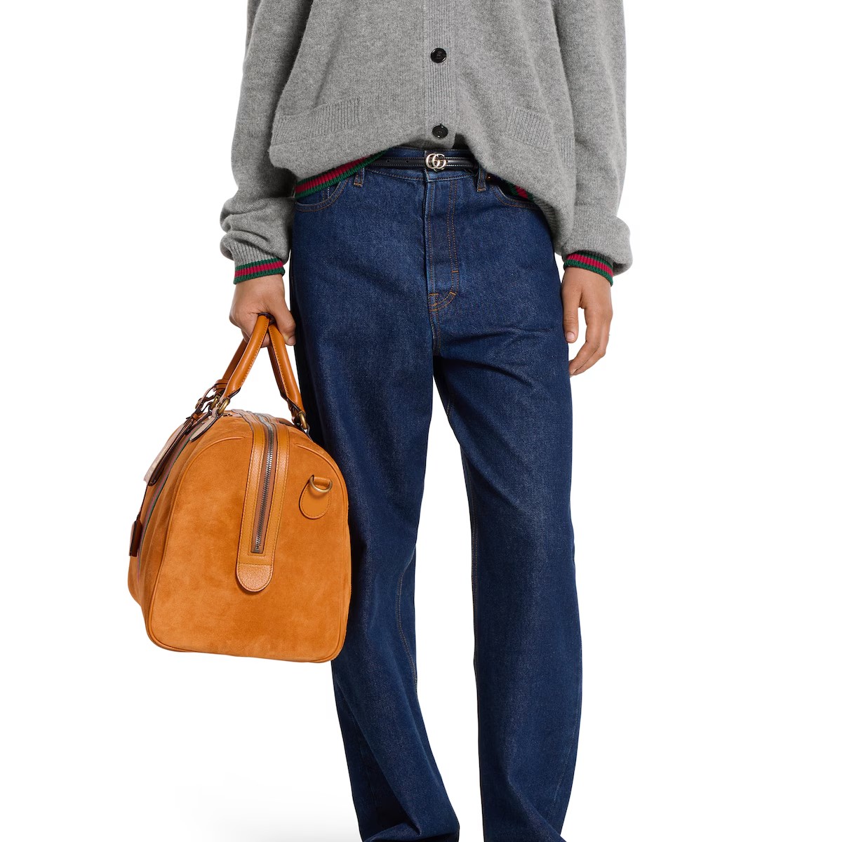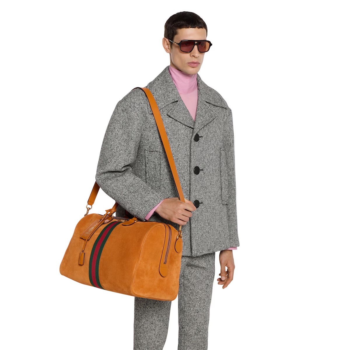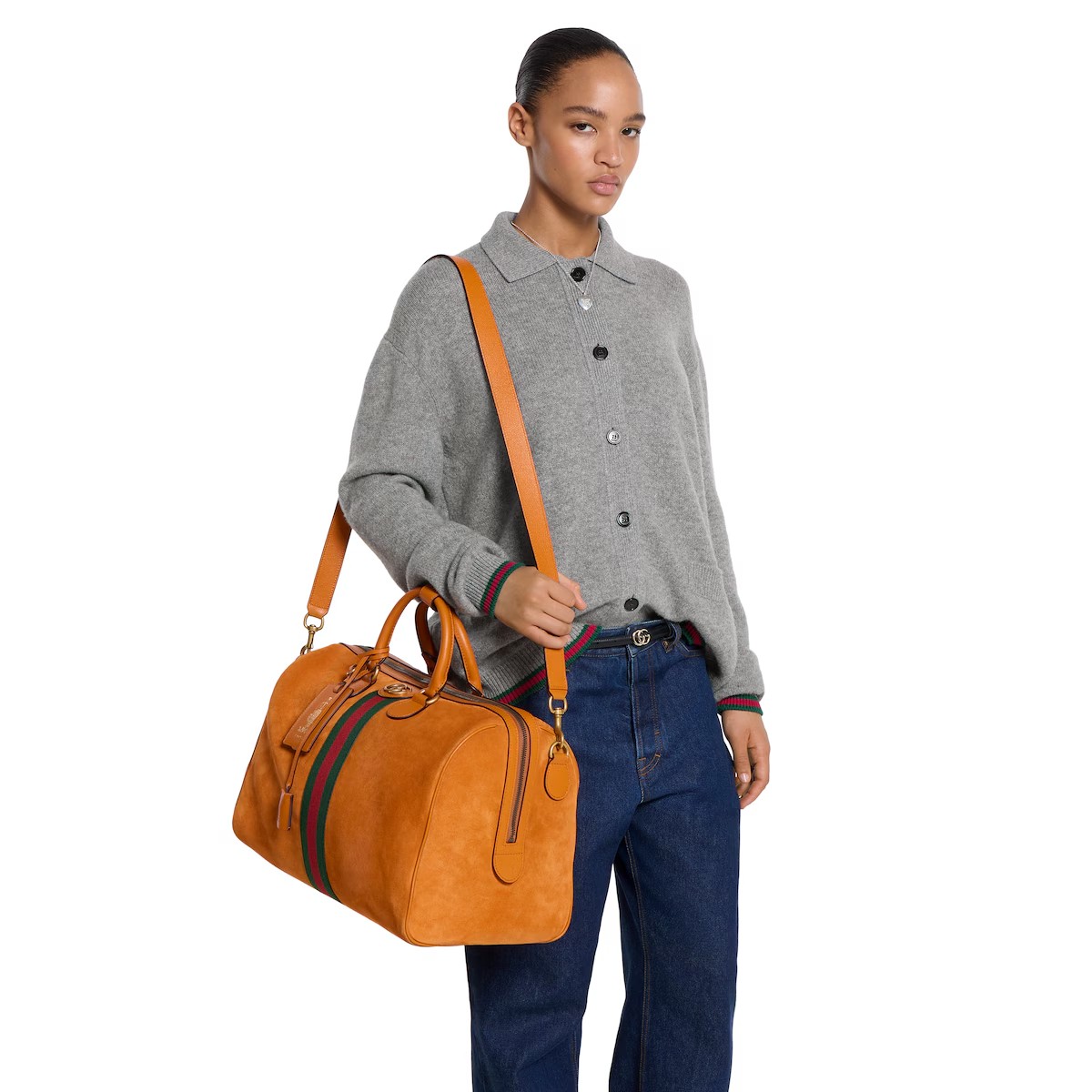 스웨이드와 레더 트리밍을 매치하여 조화로운 질감과 깊이를 선보이는 2025 가을-겨울 컬렉션의 구찌 사보이. 하우스의 시그니처 웹(Web) 및 더블 G 디테일이 돋보이는 세련된 소재를 통해 시대를 초월한 우아함을 반영한 더플 실루엣.