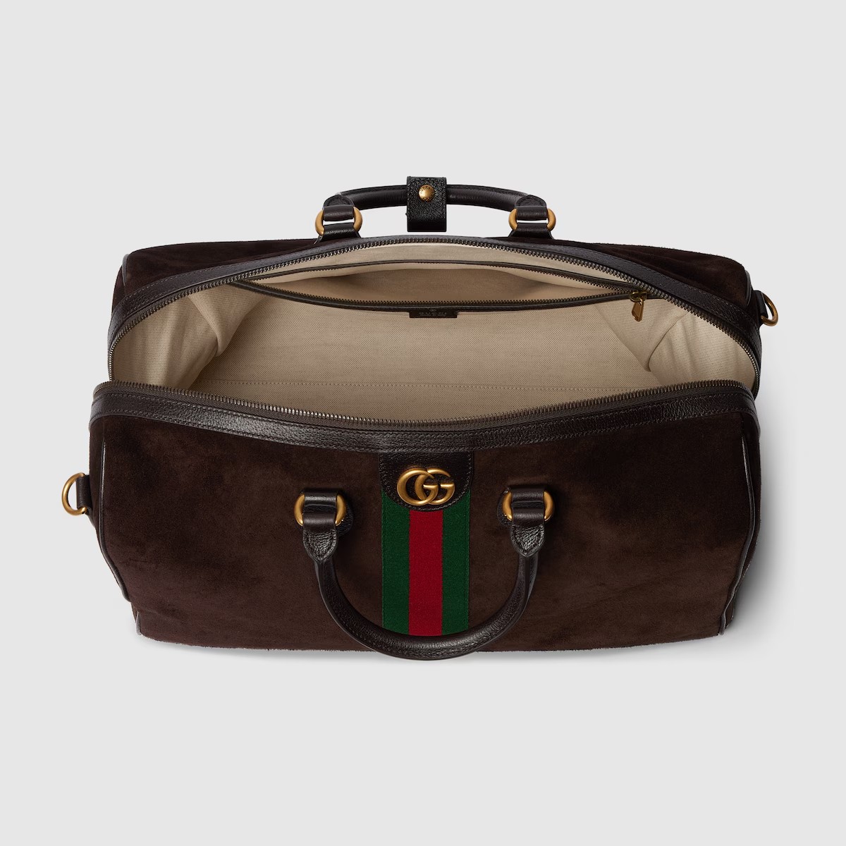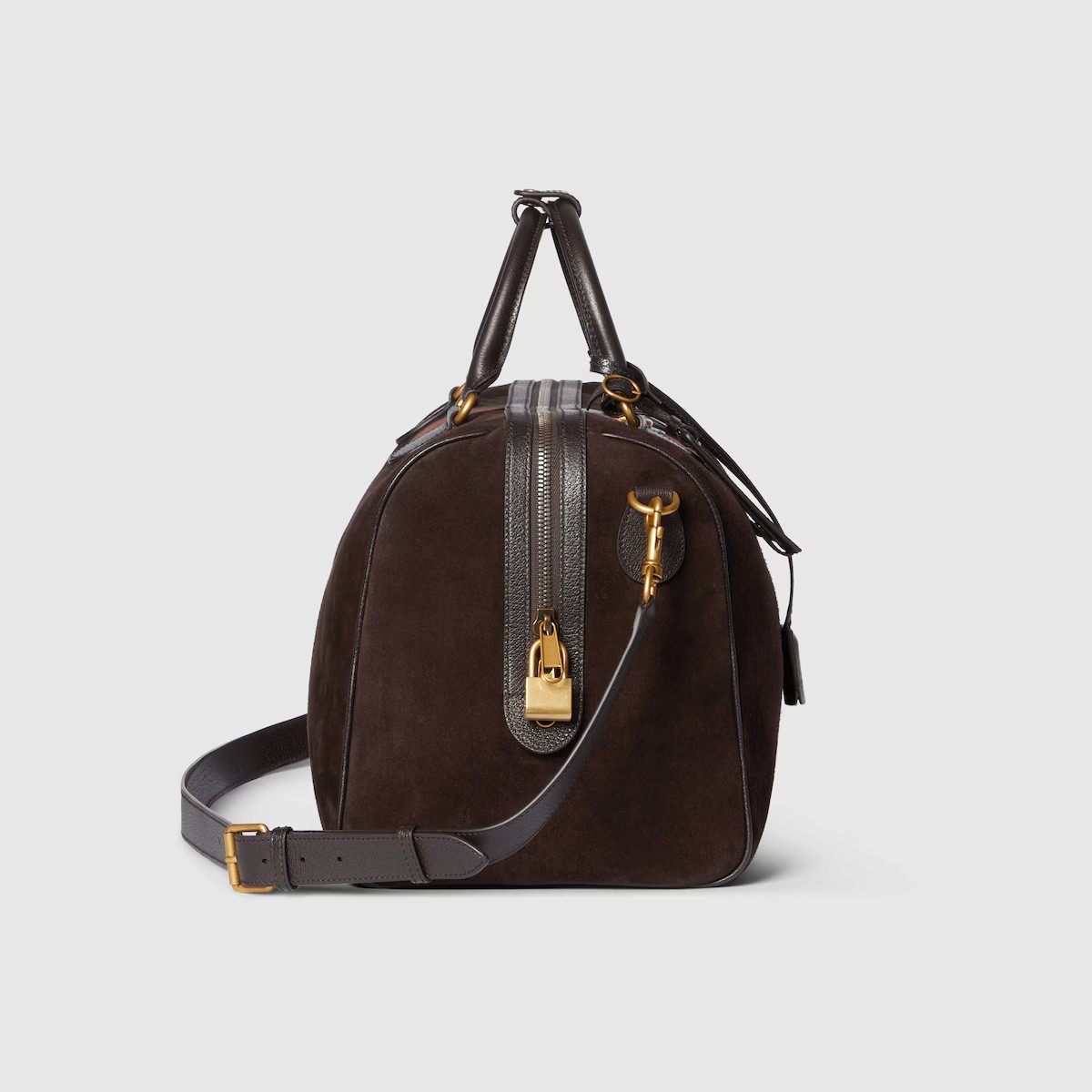 더플 스웨이드와 레더 트리밍을 조합하여 질감과 깊이를 표현한 다크 브라운 컬러의 구찌 사보이. 하우스의 시그니처 웹(Web) 및 더블 G 디테일이 돋보이는 세련된 소재를 통해 시대를 초월한 우아함을 반영한 더플 실루엣.