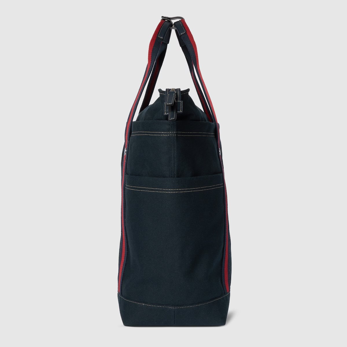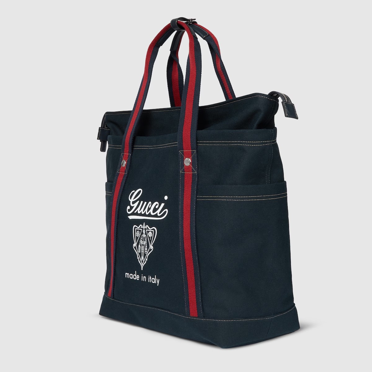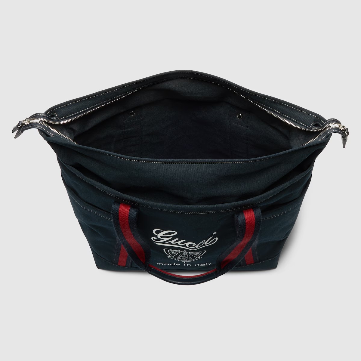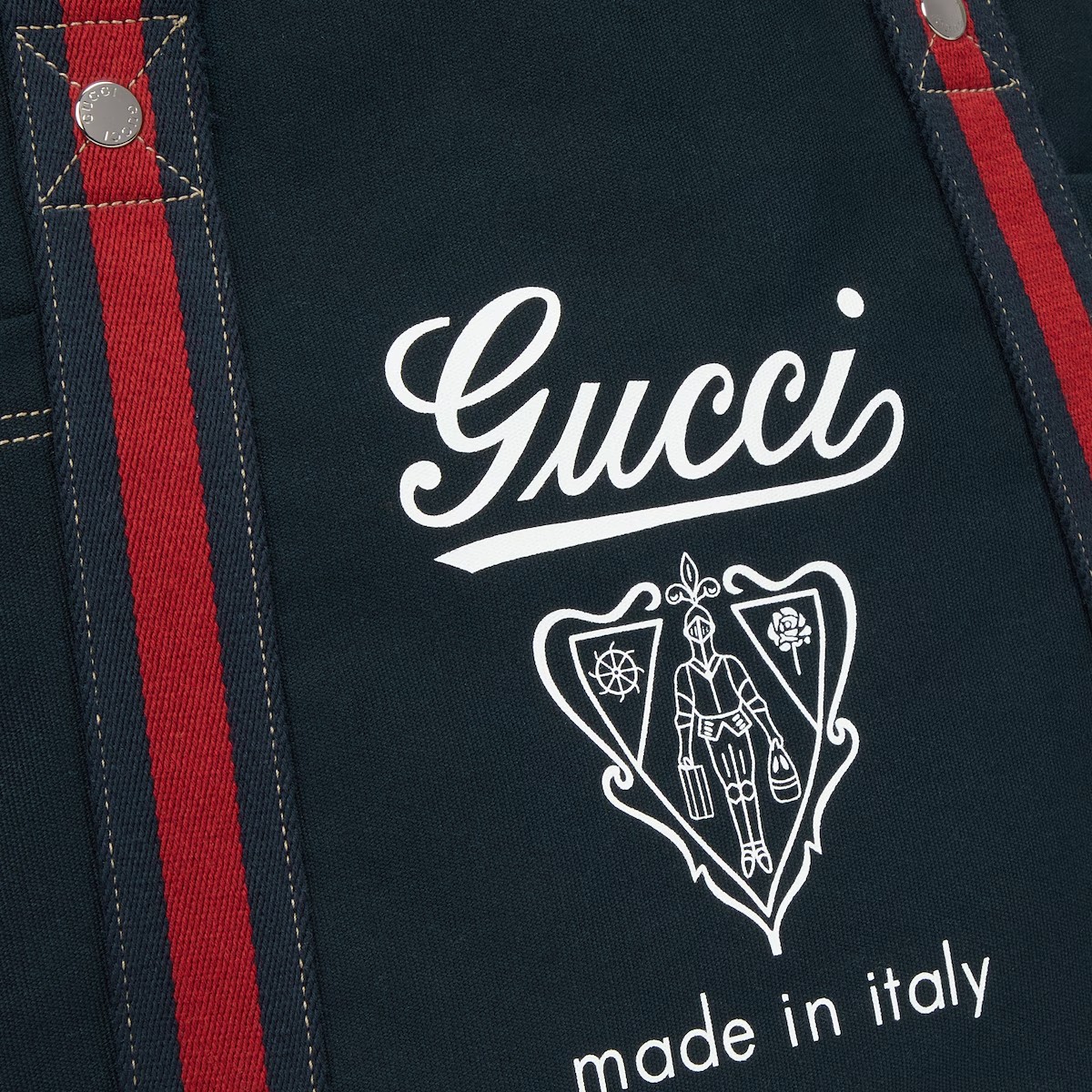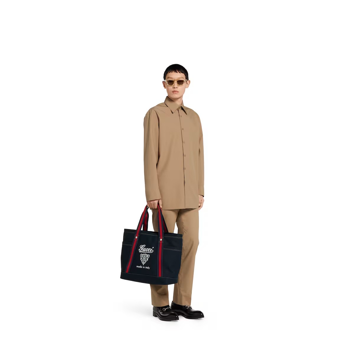 2025 봄 여름 남성 컬렉션은 새로운 모험에 어울리는 최신 트래블 아이템 및 남성 가방 셀렉션으로 자유, 에너지, 커뮤니티의 정신을 표현함. 비슷한 톤 배색의 레더 트리밍에 탑 스티치 디테일을 더하고 앞면의 'Gucci Made in Italy' 크레스트 프린트로 포인트를 준 캔버스 가방.
