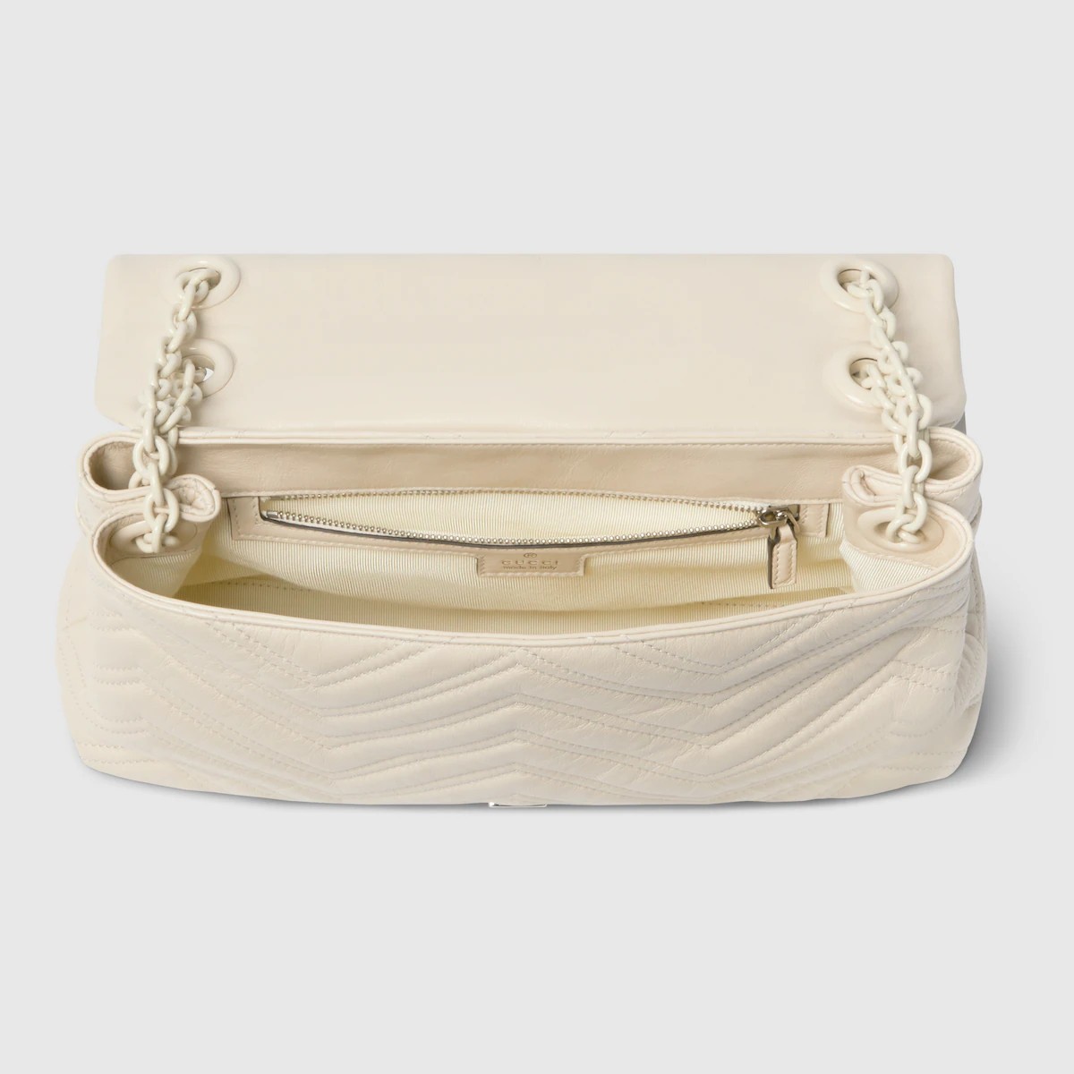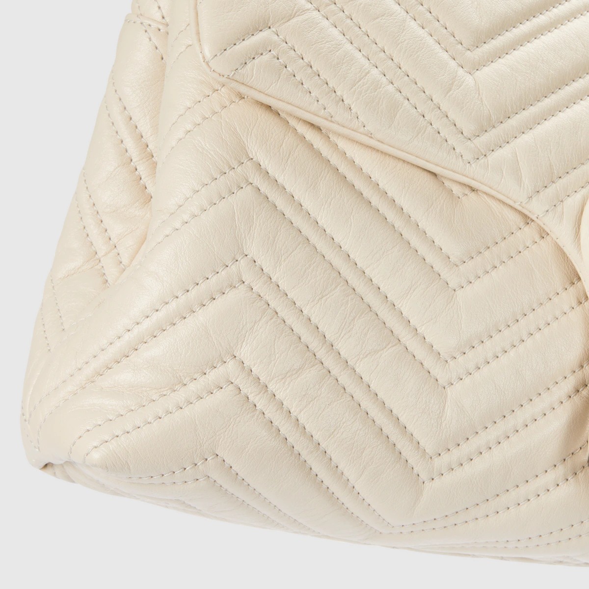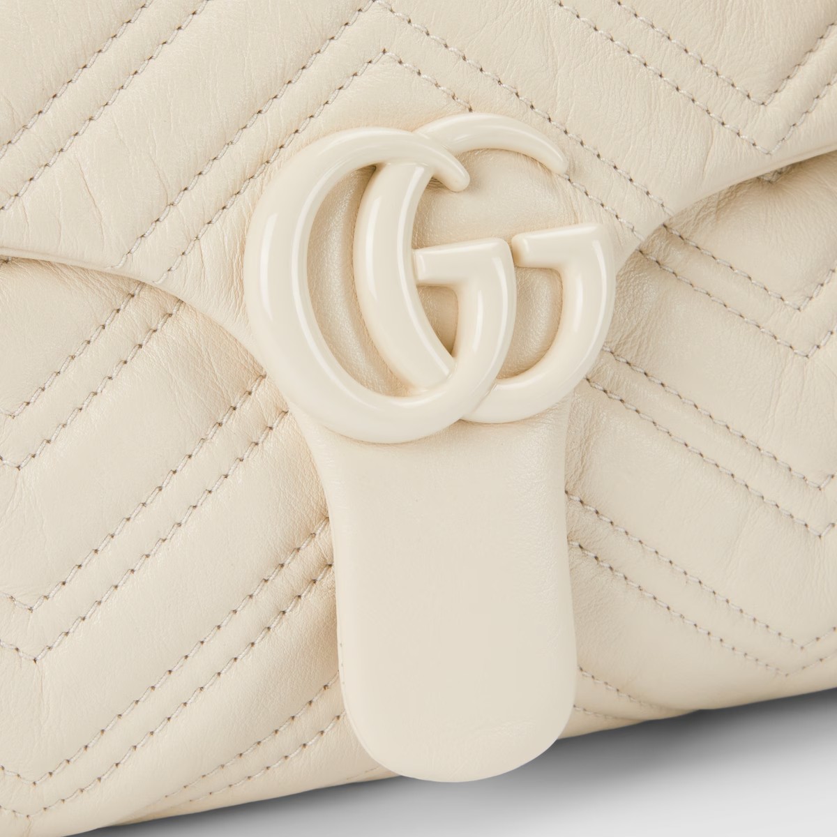 2025 가을-겨울 컬렉션, 상징적인 더블 G, 다면체 체인 스트랩, 부드러운 구조감이 돋보이는 실루엣이 특징인 하우스의 시그니처 컬렉션 GG 마몽. 부드럽고 가벼운 마틀라세 쉐브론 레더 소재에 토널 에나멜 메탈 장식과 체인을 더한 스타일.