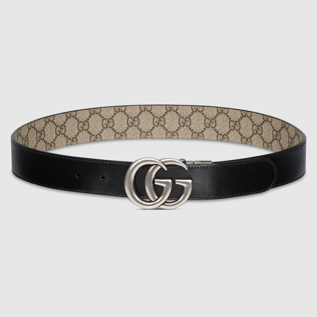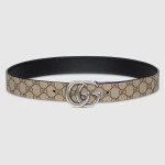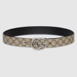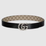 다양하게 활용할 수 있는 디자인으로 시대나 계절에 구애받지 않고 계속 착용할 수 있는 리버서블 레더 벨트. 베이지/에보니 GG 수프림 캔버스와 블랙 레더로 제공됨. 대표적인 더블 G 메탈 장식은 아카이브를 떠올리게 하는 컨템포러리 디자인으로 완성됨.