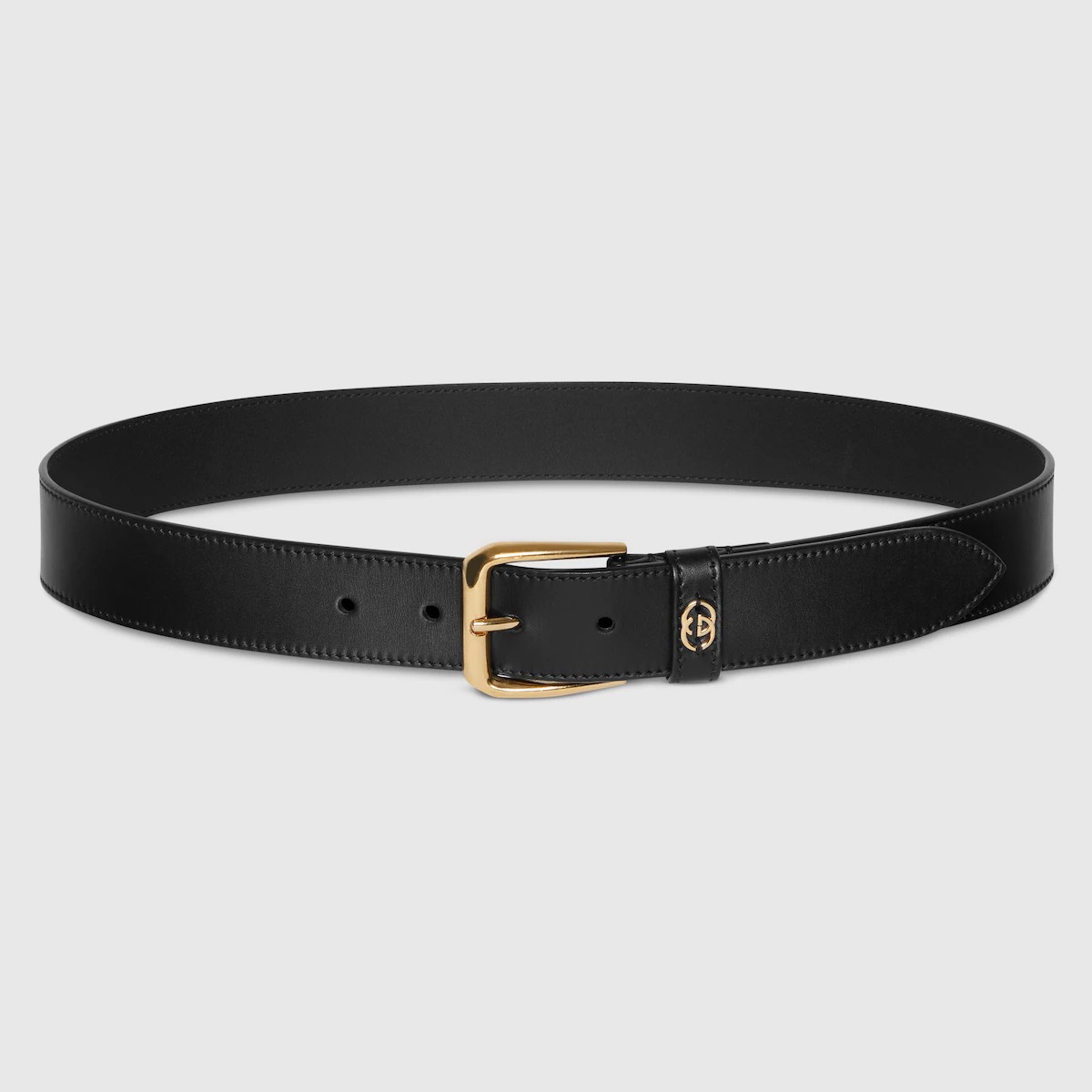 매끄러운 블랙 레더 소재의 스퀘어 버클 벨트. 절제된 인터로킹 G 메탈 장식이 특징적임. 브랜드의 유서 깊은 상징인 모노그램으로 브랜드 창립자 구찌오 구찌(Guccio Gucci)에게 경의를 표함.