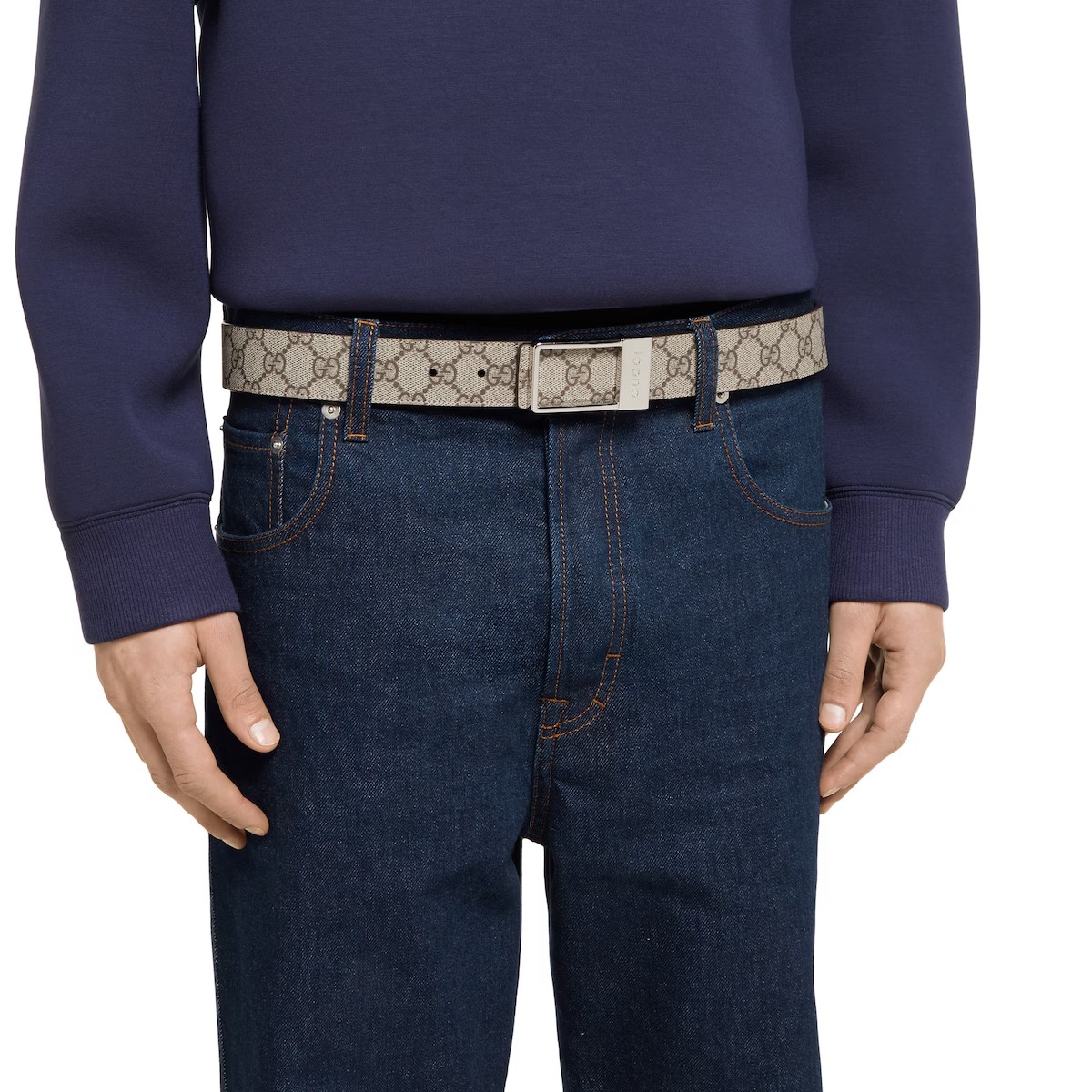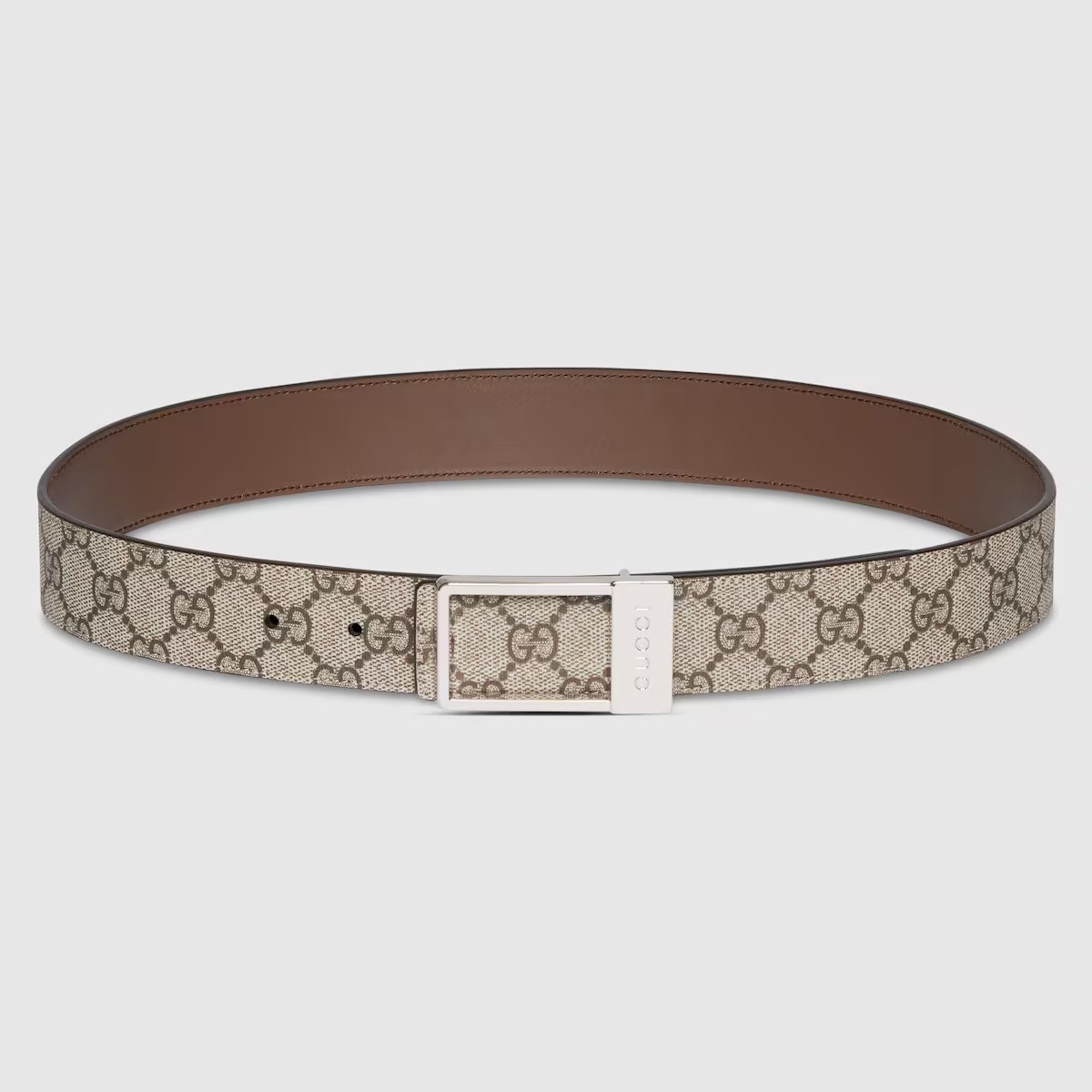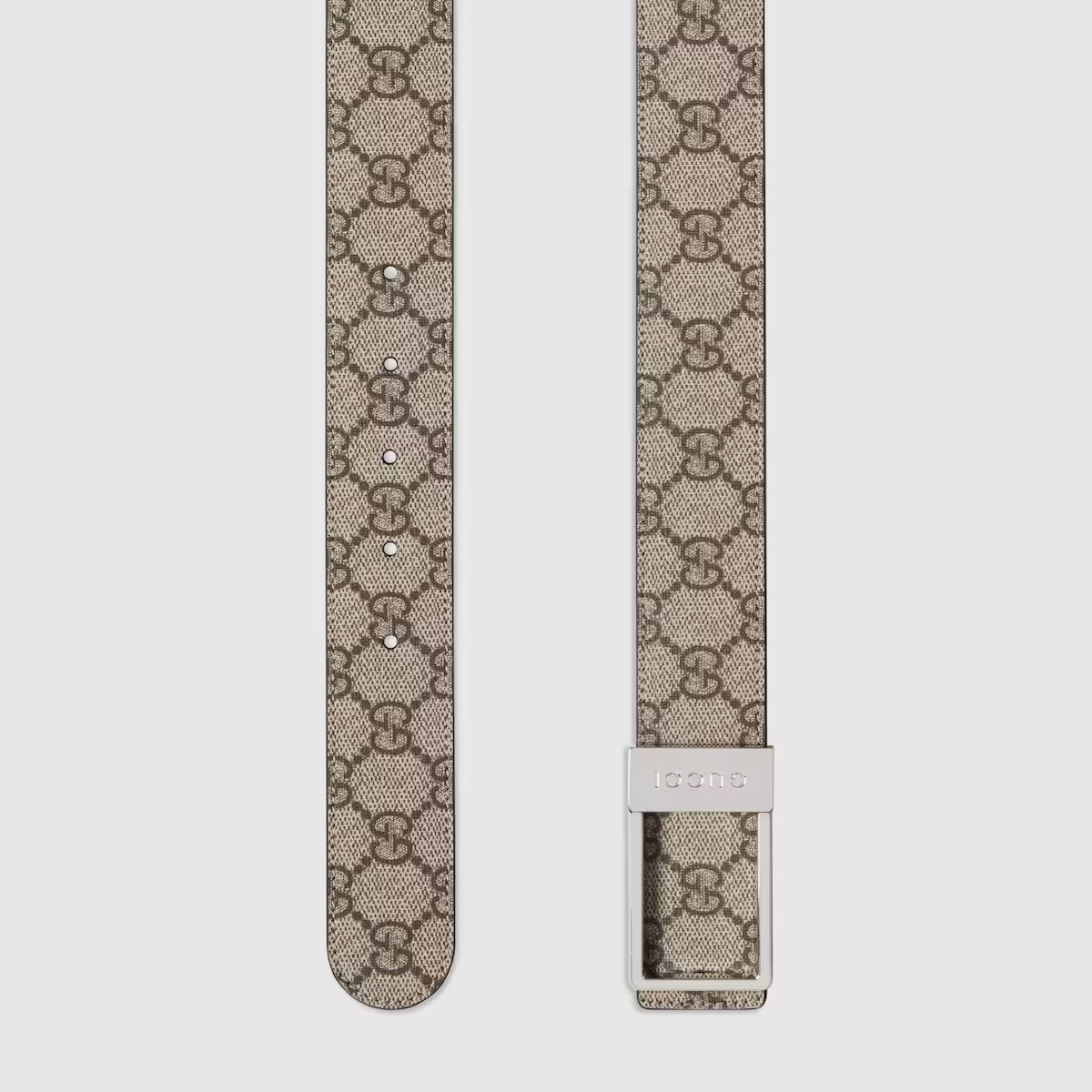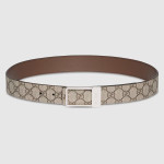 한쪽 면에는 스 시그니처 모티브를, 반대쪽 면에는 자연스러운 컬러의 레더를 배치한 남성용 직사각형 버클 리버서블 벨트. 구찌 인그레이빙 디테일을 더한 직사각형 버클이 눈에 띄는 GG 수프림 및 부드러운 레더 소재의 디자인.