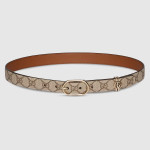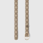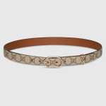 클래식한 레더 아이템을 재해석하여 새로운 디테일로 신선한 느낌을 더했습니다. 새로운 베이지/다크 브라운 GG 모노그램 코팅 패브릭으로 제작하고 타원형 버클과 더블 G 디테일로 마감한 활용도 높은 벨트입니다.
