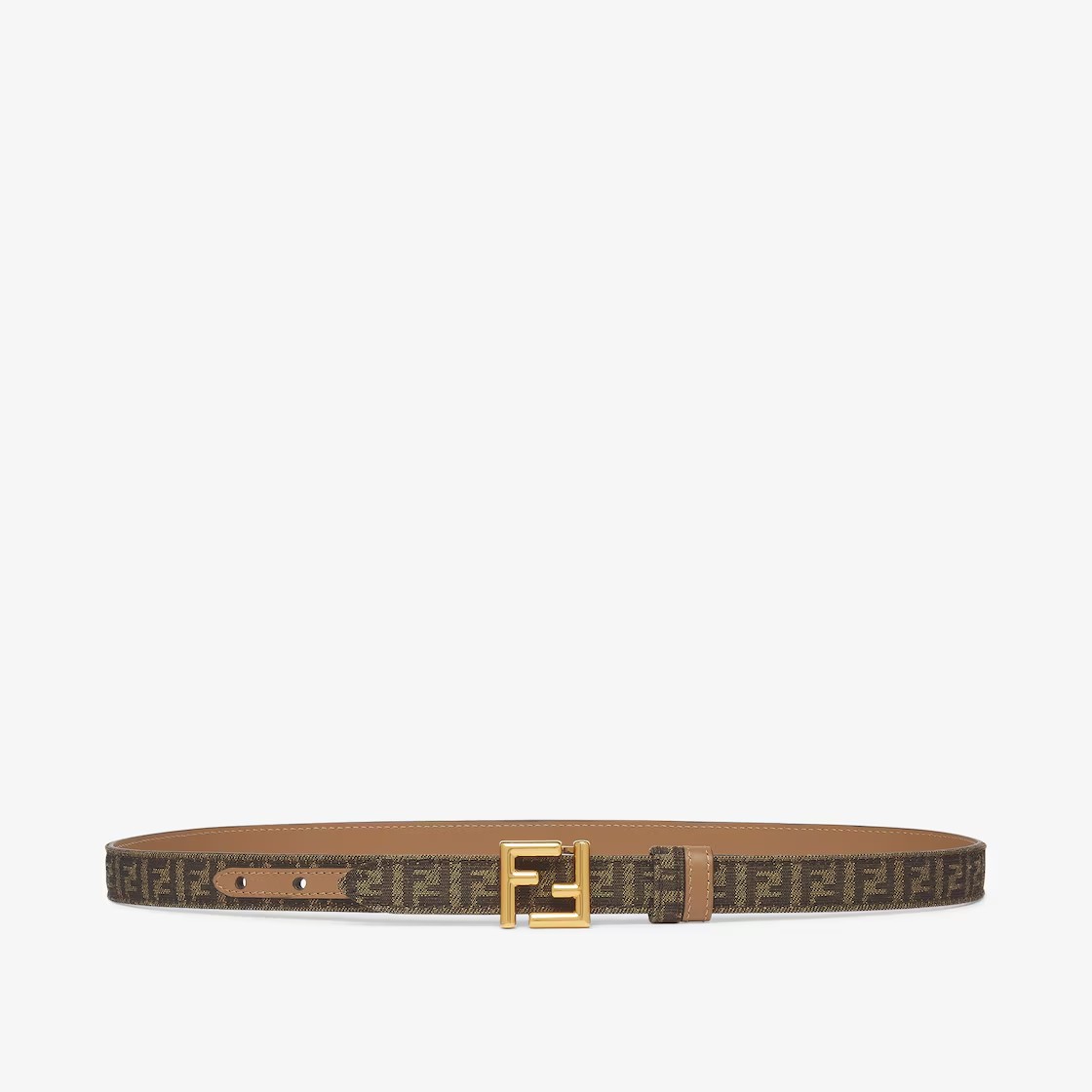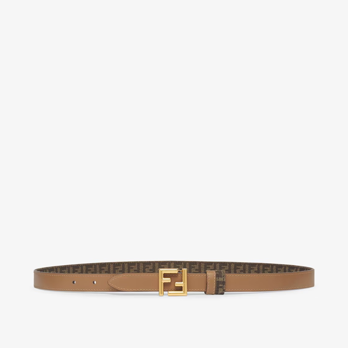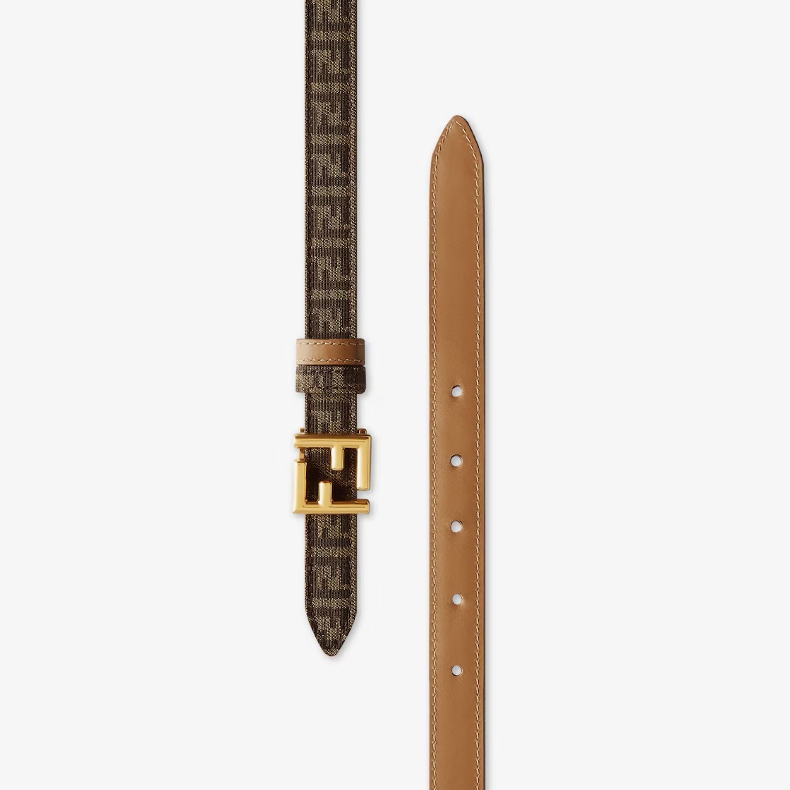 리버서블 벨트. 루프 및 FF 스터드 버클. 한 면은 아이코닉한 브라운 FF 모티프의 자카드 패브릭, 다른 면의 베이지 가죽 소재. 빈티지 골드 피니시의 메탈 액세서리. Made in Italy