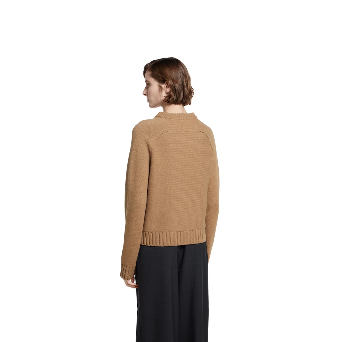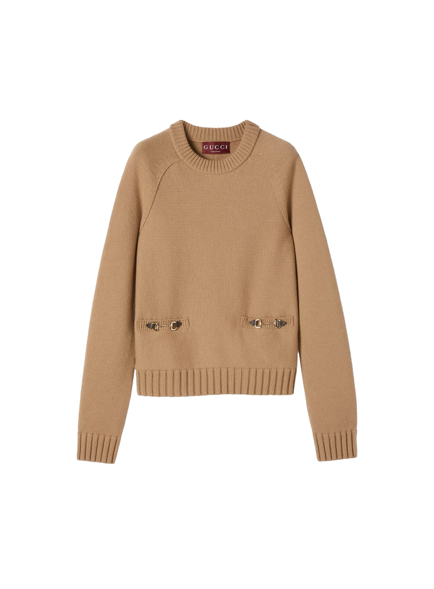 2025 프리폴 컬렉션에서 울 캐시미어 블렌드로 선보인 롱 슬리브 크루넥 탑. 앞면의 홀스빗 메탈 장식 디테일 2개가 클래식한 디자인에 품격을 더함.